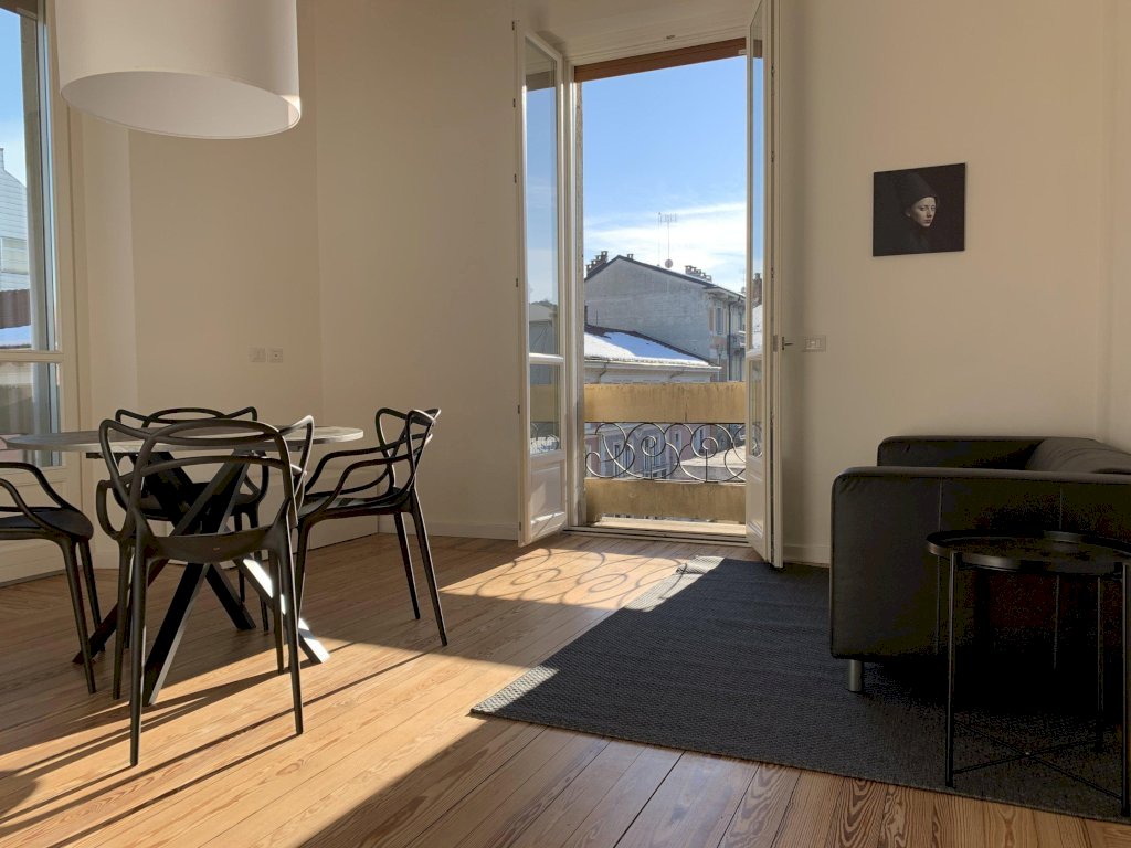 Affittasi appartamento in stabile d'epoca, situato in zona centrale. L'immobile è stato progettato dall'Arch. Dario Castellino e arredato con mobili di design. L'ingresso accogliente presenta una pavimentazione originale e una contro-soffittatura a faretti. La zona living è spaziosa e molto luminosa, con soffitti decorati da stucchi e pavimentazione in legno. La cucina è completamente attrezzata e la camera matrimoniale è elegante, con l'egg chair come protagonista. C'è anche una seconda camera singola raffinata, arredata con mobili laccati lucidi. Il bagno è bello e dotato di doccia. L'appartamento dispone di due balconcini con vista su bei palazzi Liberty. È adatto a single o massimo due adulti con ragazzo. Si richiedono referenze e dimostrazione di reddito. La superficie commerciale è di 75 m², di cui 70 m² calpestabili. L'appartamento è composto da 3 locali e 1 bagno. Si trova al quarto piano senza ascensore, con orientamento Sud, molto luminoso. La cucina è dotata di elettrodomestici e l'intera casa è arredata.