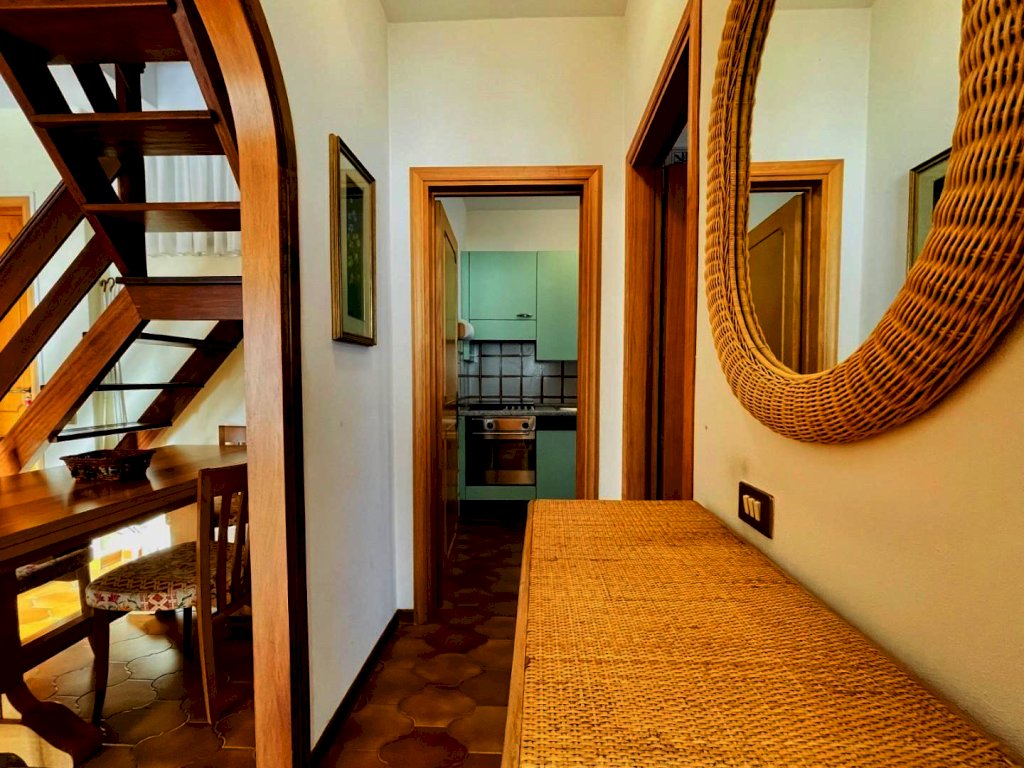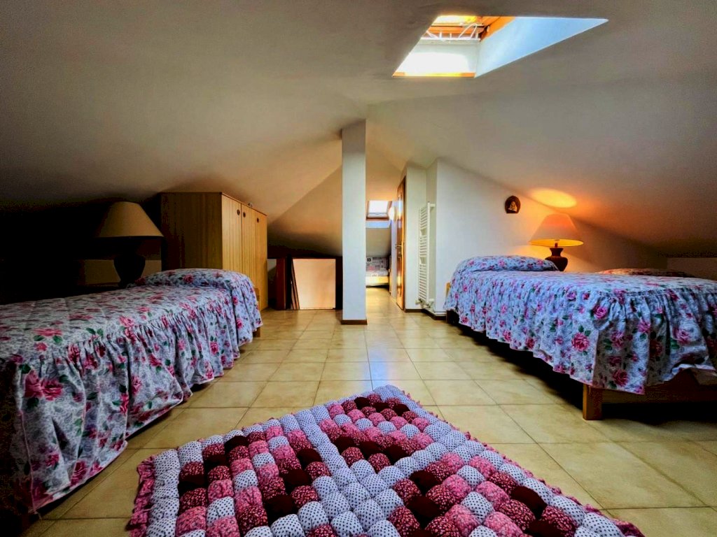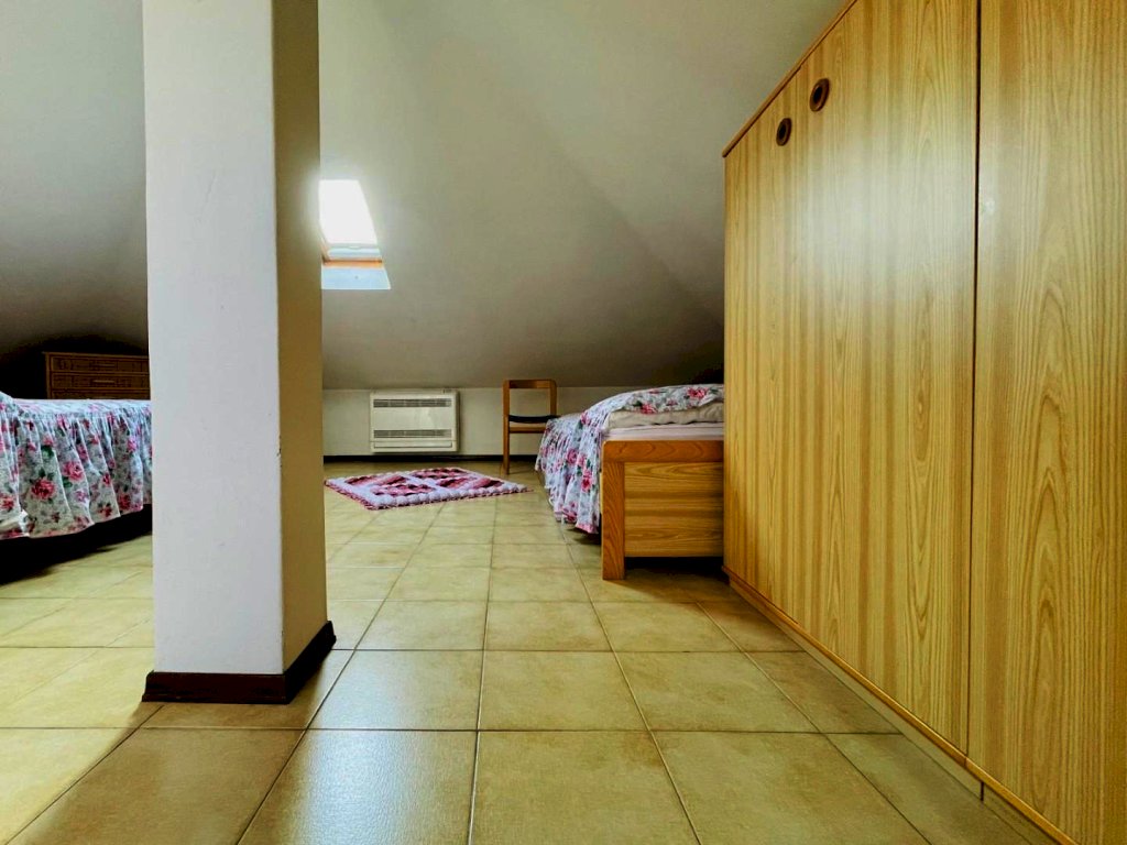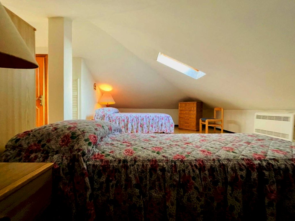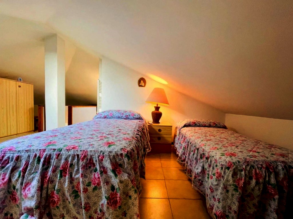 La zona giorno si compone di un generoso salotto con terrazza abitabile dotata di tende e arredamento da esterno quali tavolo e sedie per godere dei periodi miti della stagione. Percorrendo il disimpegno si raggiunge il cucinotto con lavastoviglie e balcone. Questo livello include una prima camera matrimoniale ed un bagno con la doccia. Attraverso la scala in legno si sale a piano superiore, in parte mansardata. Questo piano ospita tre letti singoli ed un bagno di servizio.