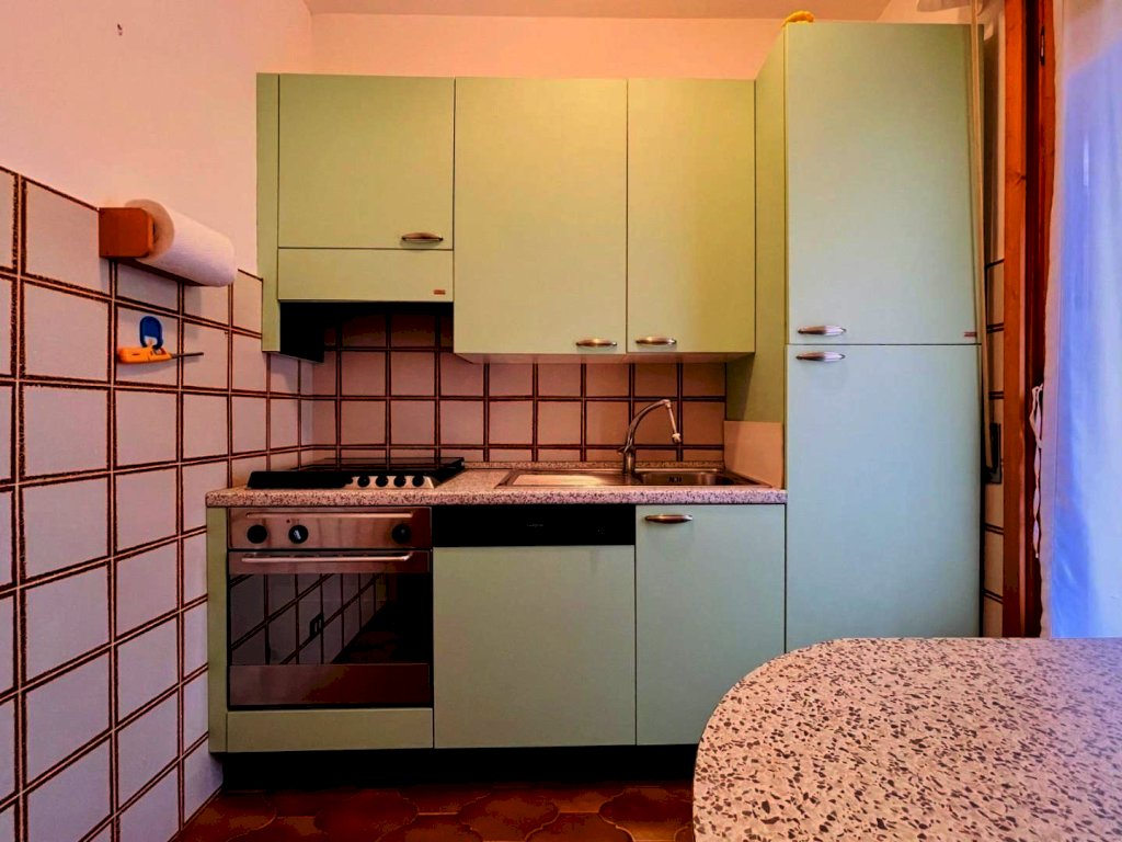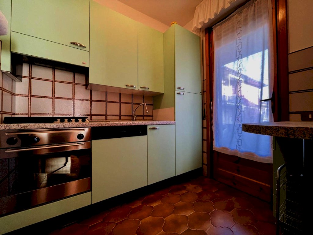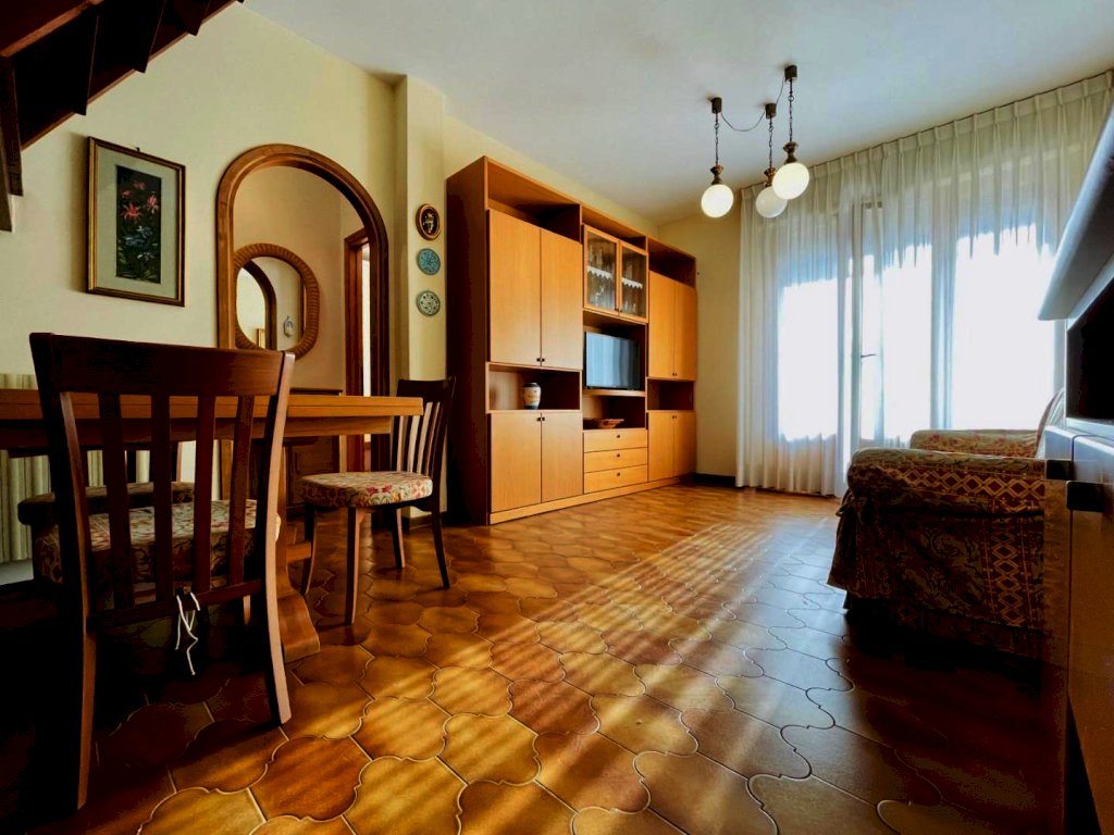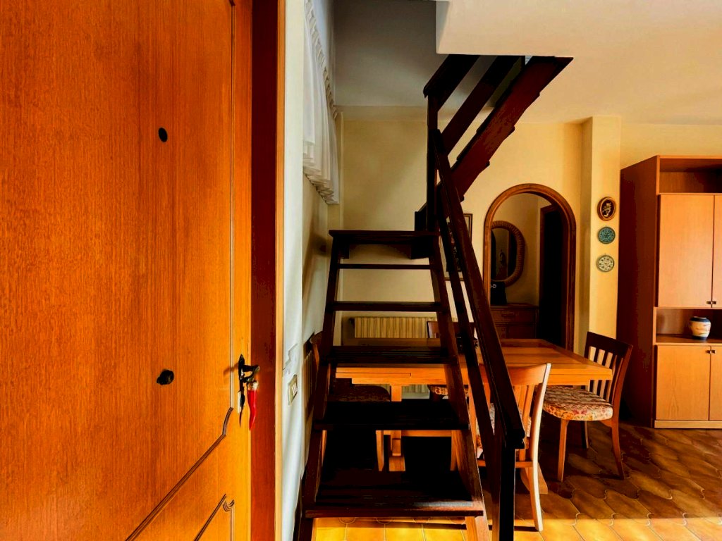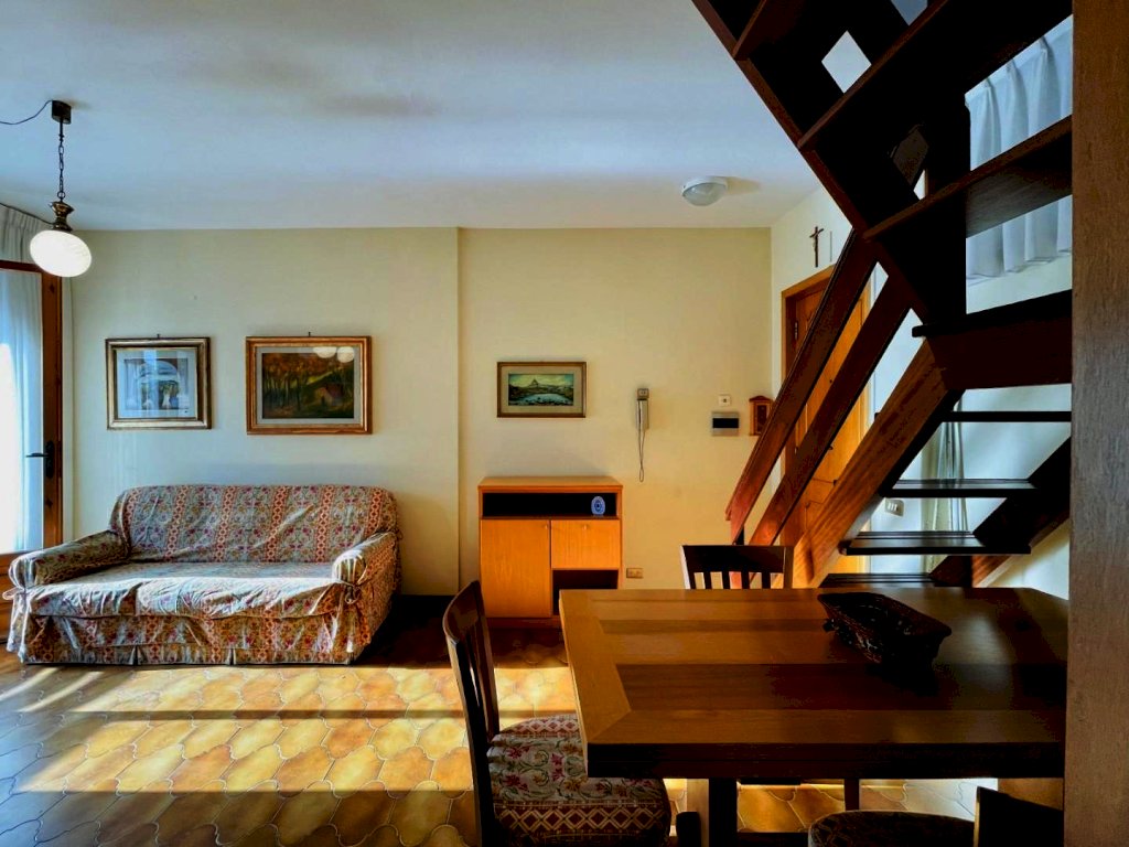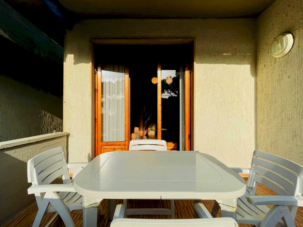 La zona giorno si compone di un generoso salotto con terrazza abitabile dotata di tende e arredamento da esterno quali tavolo e sedie per godere dei periodi miti della stagione. Percorrendo il disimpegno si raggiunge il cucinotto con lavastoviglie e balcone. Questo livello include una prima camera matrimoniale ed un bagno con la doccia. Attraverso la scala in legno si sale a piano superiore, in parte mansardata. Questo piano ospita tre letti singoli ed un bagno di servizio.