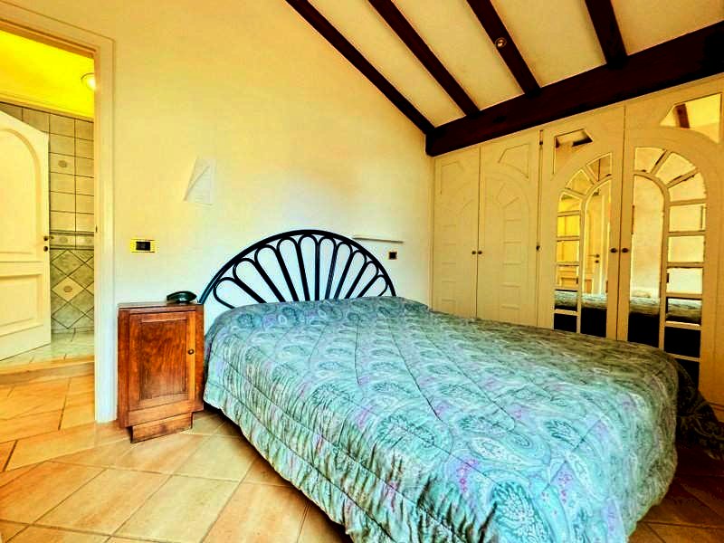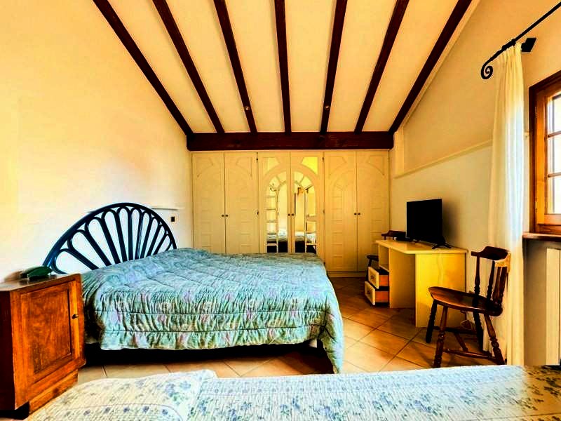 L'abitazione si distingue per il suo stile rustico-elegante con elementi classici. La camera matrimoniale (2 pax) e la camera padronale (3 pax), quest'ultima con lettino singolo aggiuntivo e bagno en suite, sono caratterizzate da soffitti mansardati con travi in legno a vista e pavimenti in cotto, che donano calore e charme agli ambienti. L'arredamento unisce eleganza e tradizione, con armadi a specchio decorati e dettagli dal fascino artigianale. Completa la zona notte un secondo bagno con vasca.