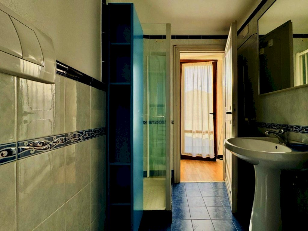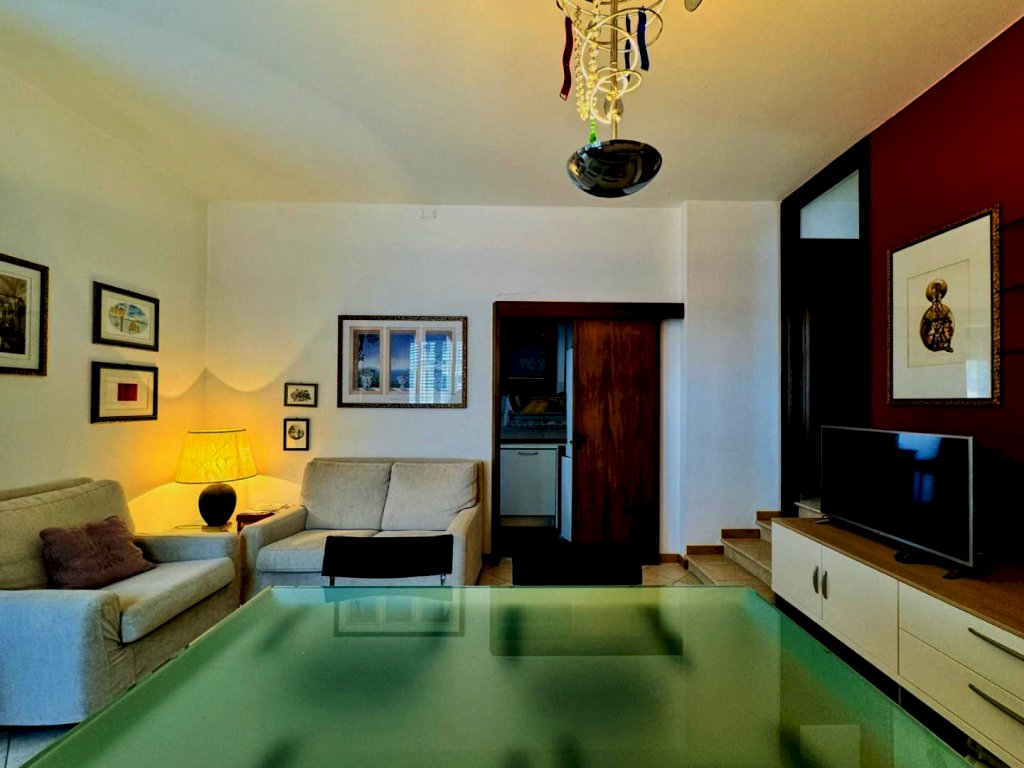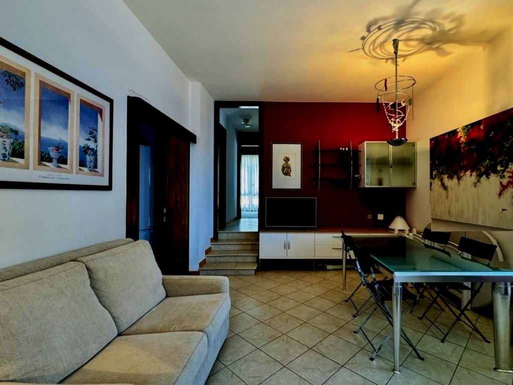 L'ingresso alla casa avviene a piano terreno ed attraverso la scala interna si giunge al piano primo. La zona giorno si compone di generoso soggiorno con cucinotto (dotato di lavastoviglie) e sala pranzo annessa. Percorrendo il corridoio si raggiunge le prime due camere da letto, una matrimoniale ed una doppia (4 pax). Questo piano ospita inoltre un bagno con la doccia. Attraverso le porta a finestra di ogni vano di questo livello si fuoriesce sulle grande terrazze. Questi grandi spazi sono attrezzati con arredo da giardino. Salendo la scala si raggiunge poi il piano secondo, dove trova posto una terza camera doppia (2 pax) ed un secondo bagno con doccia.
