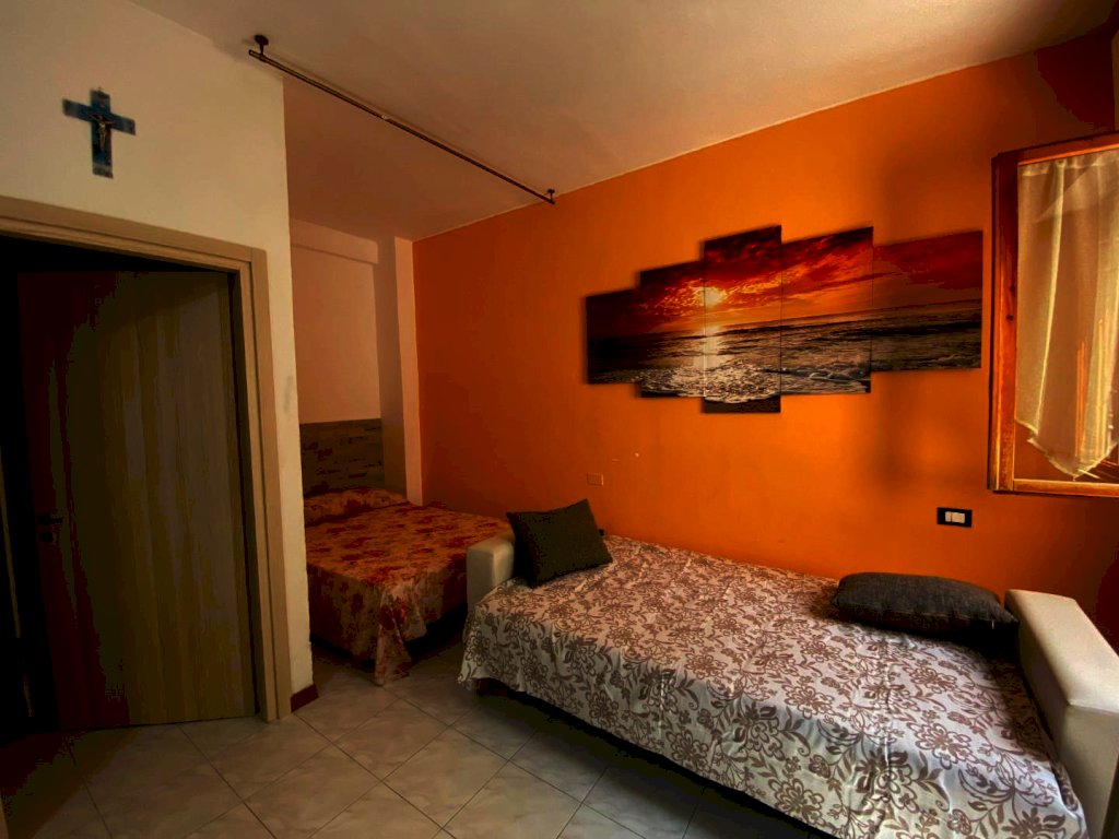 Piano rialzato monolocale con divano letto e altro letto una piazza e mezzo, bagno con finestra e cabina doccia