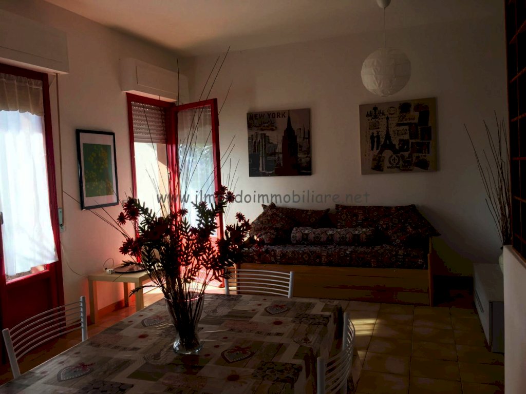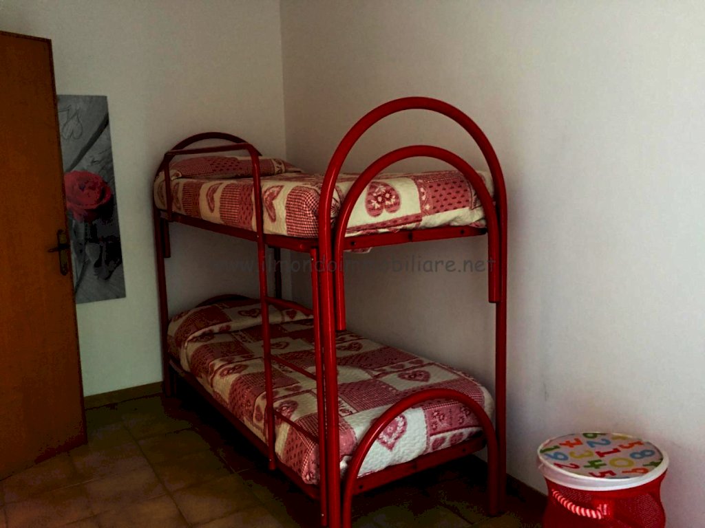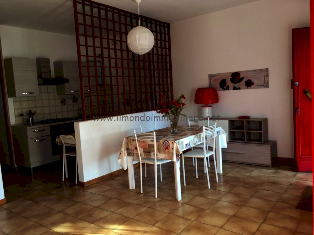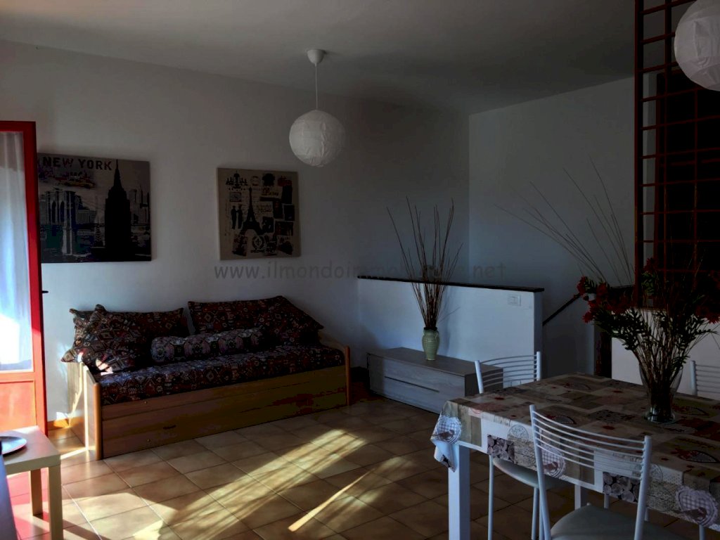 Appartamento al piano rialzato composto da: gtìrande zona giorno con angolo cottura a vista, balcone con doppio accesso dalla zona giorno, tavolo da pranzo in soggiorno con divano letto, tavolo colazione nell'angolo cottura, camera matrimoniale, camera con letto a castello, bagno con vasca e finestra; collegamento interno con taverna finestrata