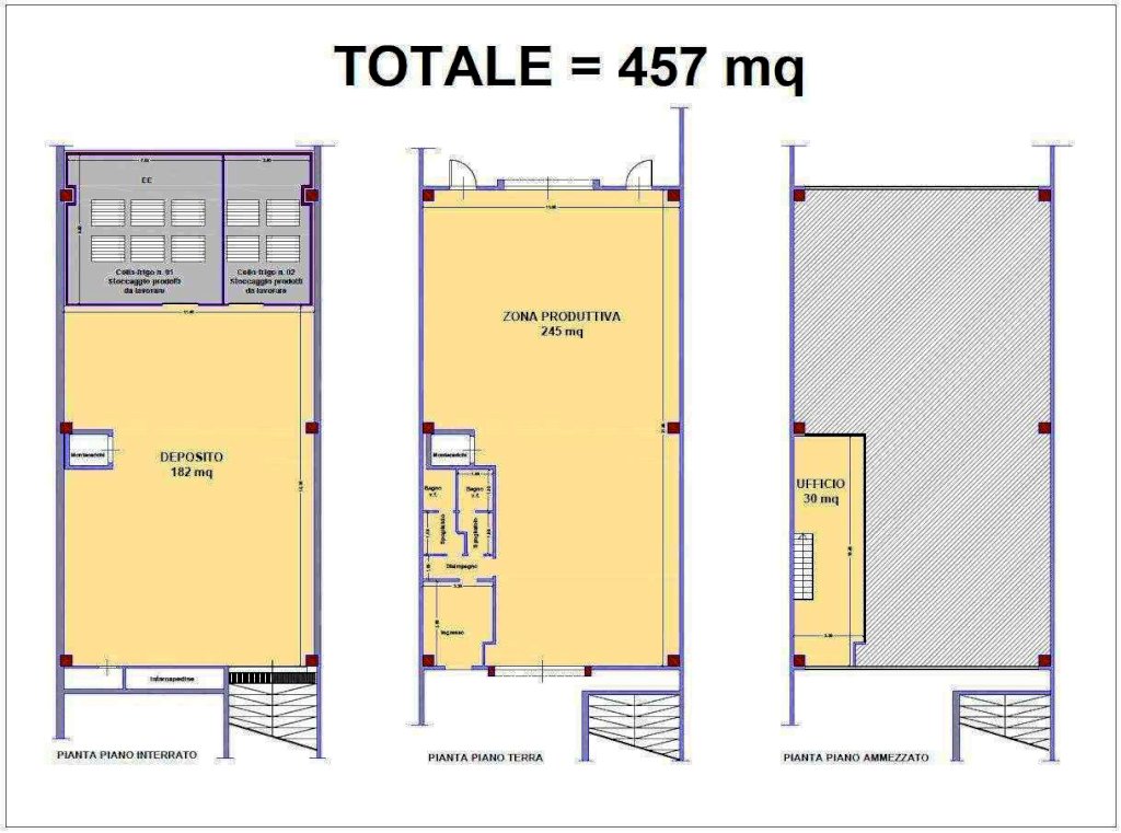 Al piano -1 è presente un deposito di circa 180 mq, ed altri 80 mq adibiti a celle frigorifere, perfetto per attività che necessitano di stoccaggio a temperatura controllata.