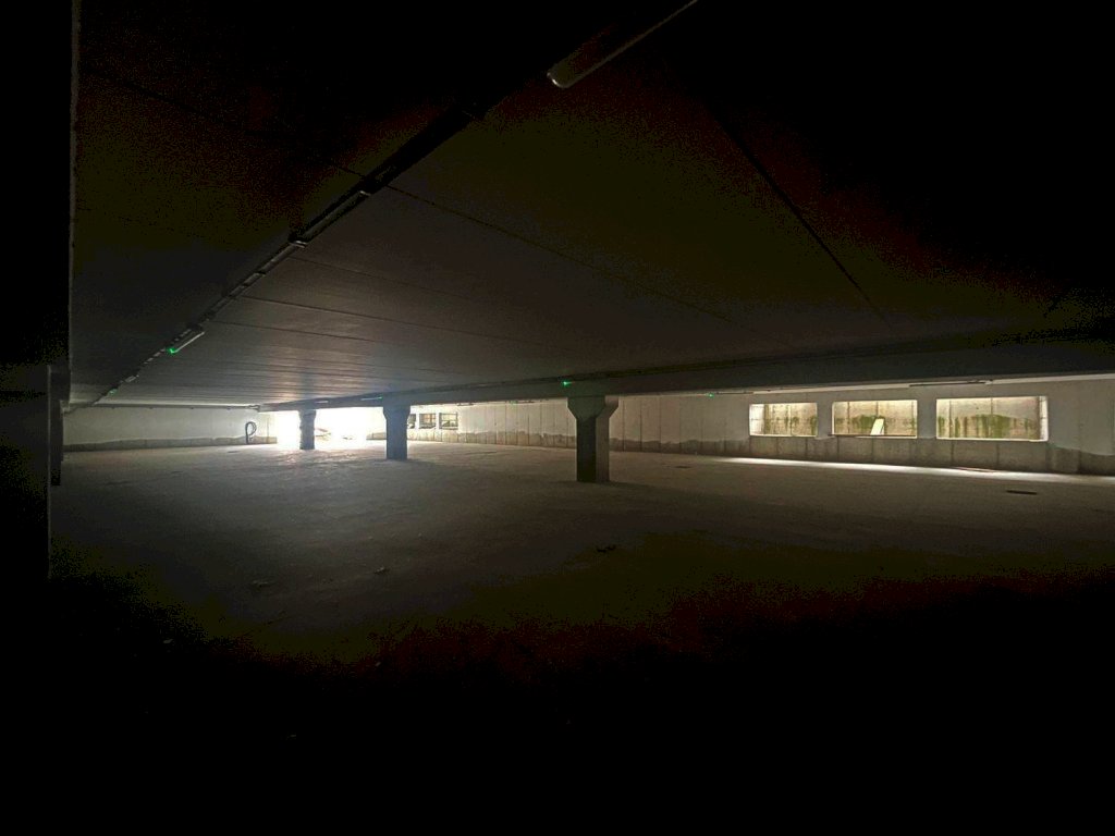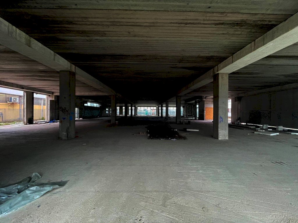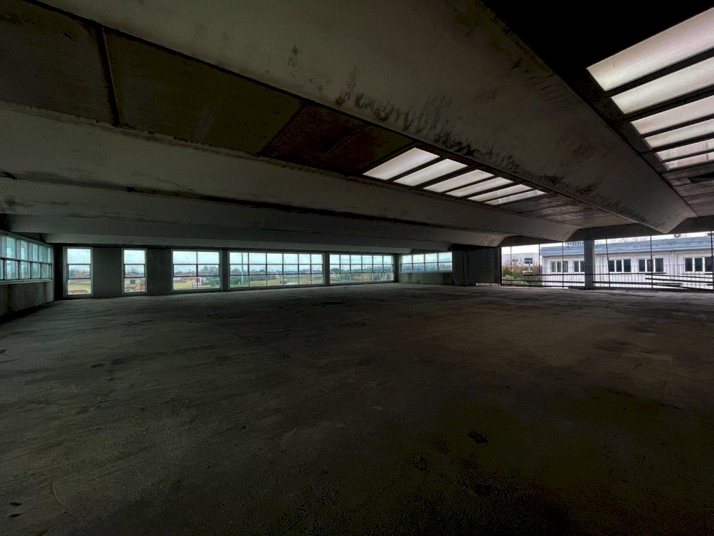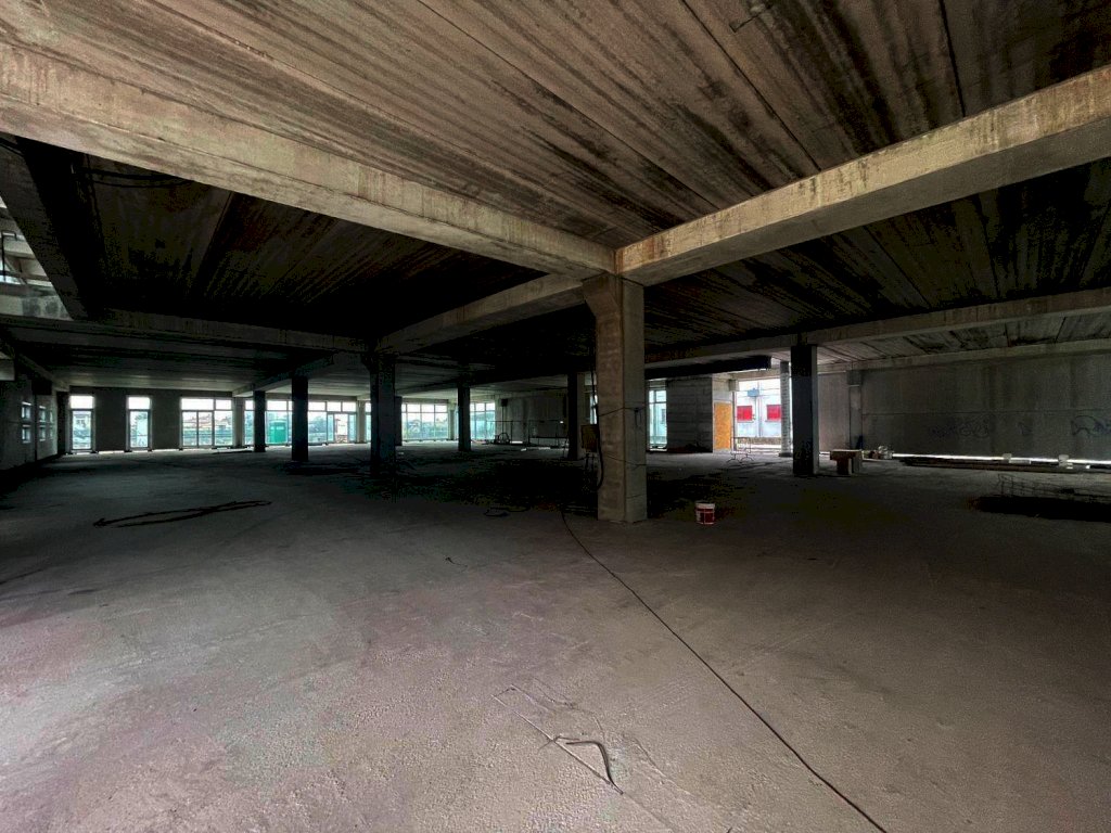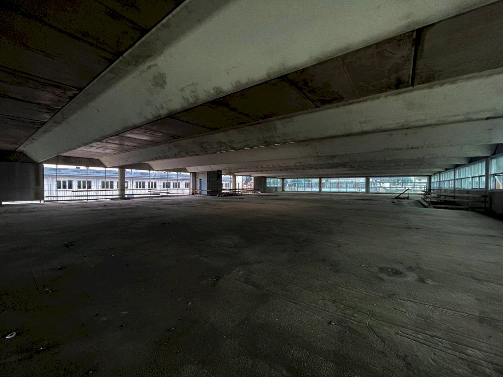 Il fabbricato è situato al centro del lotto e composto da seminterrato con 42 posti auto coperti, ampio vano al piano terra con vetrate, primo piano senza colonne con affaccio esterno vetrato lungo tutto il fabbricato e 66 posti auto scoperti distribuiti su tutto il lotto recintato.