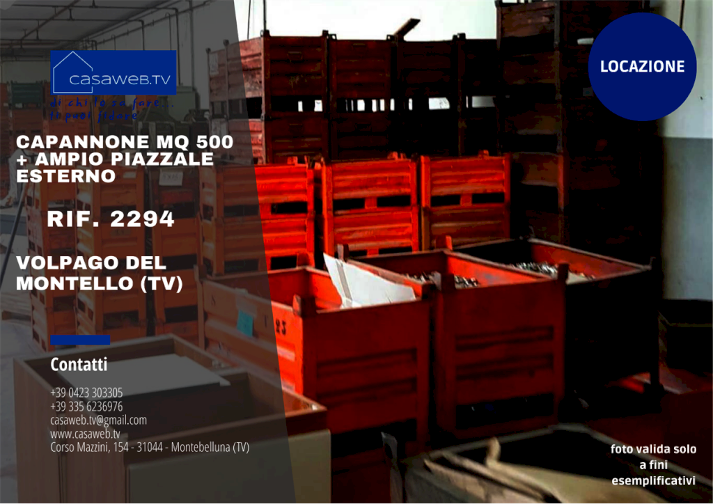 In Comune di Volpago del Montello (TV), proponiamo la locazione di un capannone di 500 mq che gode di 2900 mq di scoperto privato completamente recintato, ideale per un magazzino di materiale edile e relativi mezzi meccanici. Ottima la viabilità, accesso fronte strada da ampio cancello. Il capannone dispone di un piccolo ufficio e presenta un'altezza di 4,5 mt sotto trave. L'indirizzo dell'immobile è approssimativo per motivi legati alla tutela della privacy. - Manda un SMS o Whatsapp al 3356236976 con il testo (info 2294) aggiungi il tuo Nome e Cognome ed il Tuo indirizzo Email, saremo noi a contattarti per darti maggiori informazioni. In alternativa chiama Tel. 0423303305 - Cell. 3356236976 - Per altre proposte immobiliari, visita il nostro sito www.casaweb.tv - Ti interessa questa Proprietà? Contattaci per prenotare una visita.