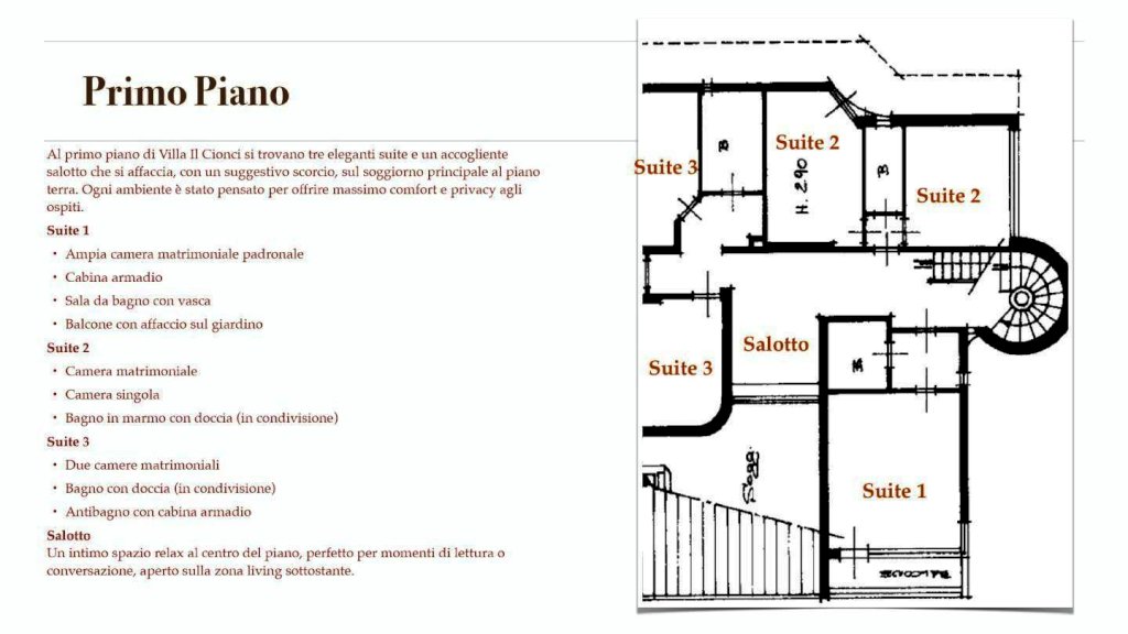 Al primo piano si trovano tre eleganti suite e un accogliente salotto che si affaccia, con un suggestivo scorcio, sul soggiorno principale al piano terra.
