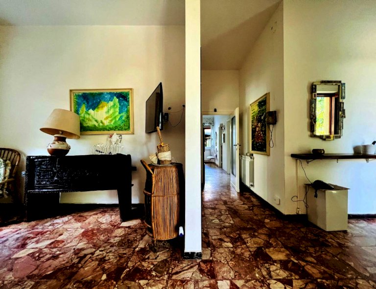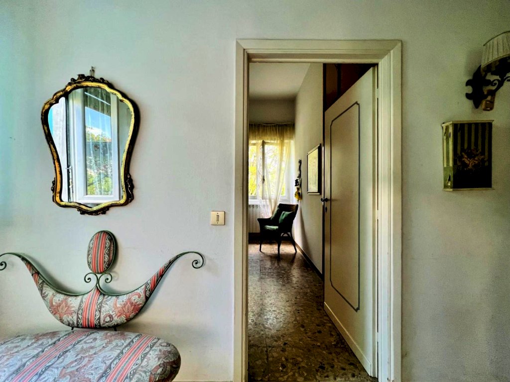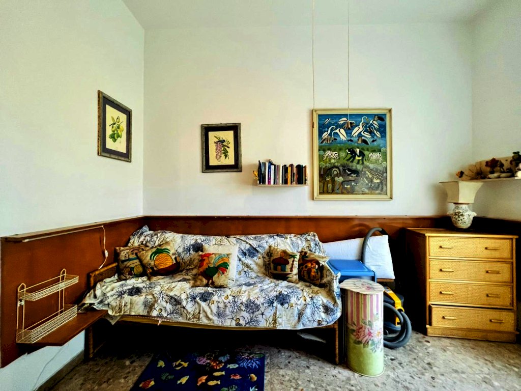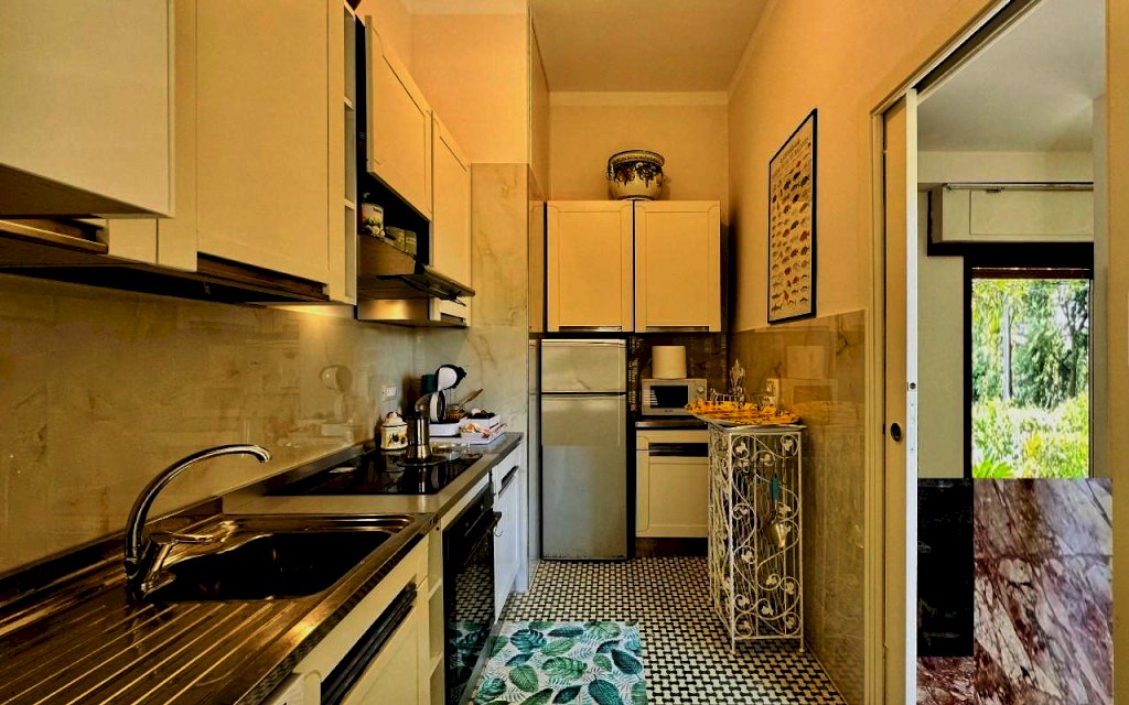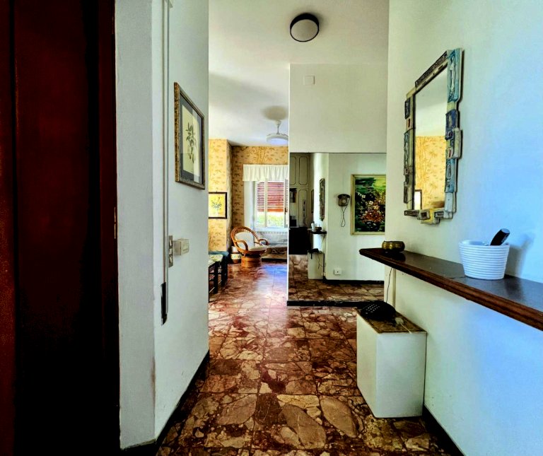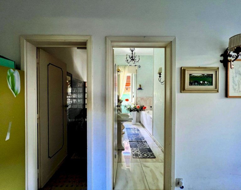 L'ingresso all'abitazione avviene tramite disimpegno, direttamente nella luminosa zona giorno con accesso alla veranda esterna, proseguendo trova posto la cucina anch'essa con uscita secondaria sulla resede.