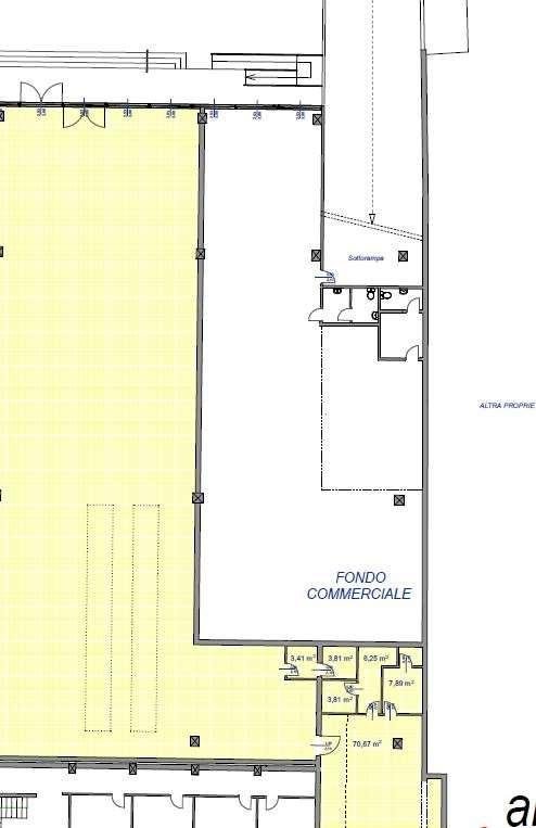 Fondo commerciale a San Concordio di 150 mq al piano terra, unico vano con doppio servizio igienico con antibagno e ripostiglio di 30 mq. A corredo piazzale per posti auto non esclusivo.