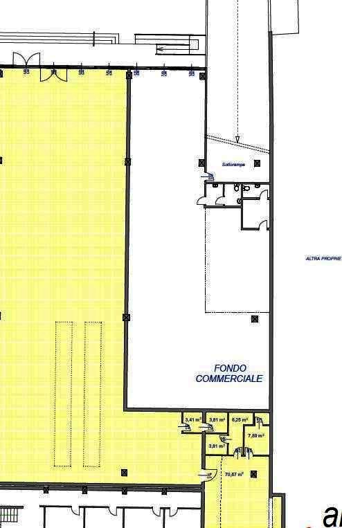 Fondo commerciale a San Concordio di 150 mq al piano terra, unico vano con doppio servizio igienico con antibagno e ripostiglio di 30 mq. A corredo piazzale per posti auto non esclusivo.