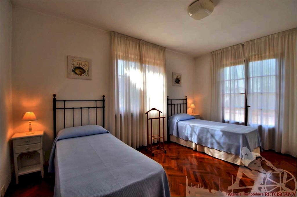 Villa in bifamiliare distribuita su due piani fuori terra con giardino su tre lati. Posizione tranquilla a pochi minuti di bicicletta dal mare. Distanza dal mare 1.400 metri circa. Al piano terra: soggiorno, pranzo, cucina abitabile con terrazza per pranzare all'aperto, bagno di servizio. Al piano primo: camera matrimoniale con bagno doccia, camera doppia, bagno con vasca, camera matrimoniale. Mansarda con camera matrimoniale e bagno con vasca. Con aria condizionata, tv satellitare, impianto di allarme e due posti auto interni alla proprietà.