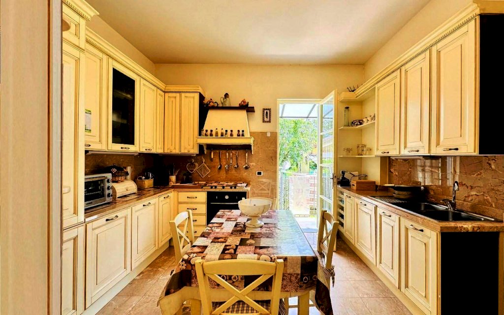 La villa si sviluppa su tre livelli sfalsati e risulta ottimamente rifinita. Dall'ingresso principale, al piano terra rialzato, si accede nell'ampio soggiorno con divani e televisione oltre all'area pranzo. Limitrofa a quest'ultima trova collocazione l'attrezzata cucina abitabile con accesso esterno al retro dell'abitazione. Collegato al soggiorno, esternamente troviamo un delizioso patio porticato, spazio ideale per potersi rilassare oltre a godersi pranzi e cene all'aperto. Sempre a questo livello trova posto un primo bagno di servizio ed una stanza armadi.