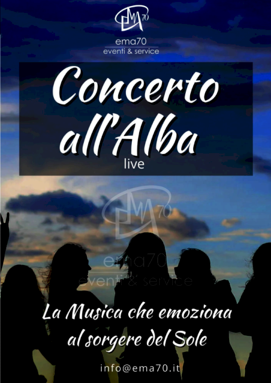 Un appuntamento all'alba rappresenta la più inconsueta proposta musicale accarezzata dalle prime luci dell`alba. Inizio concerto ore 06:15 EMA70 EVENTI, vi fornirà anche il servizio di allestimento palco e sedie. Su richiesta da parte del cliente, la EMA70 EVENTI, vi potrà fornire il servizio: Staff accoglienza del pubblico.