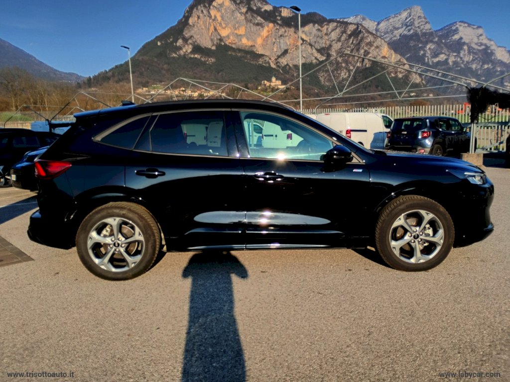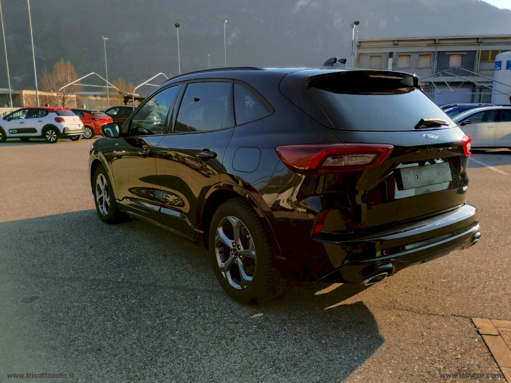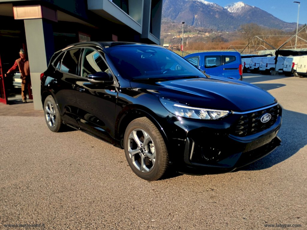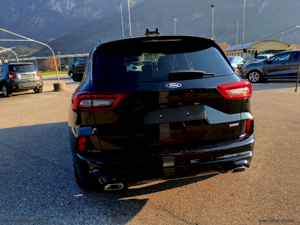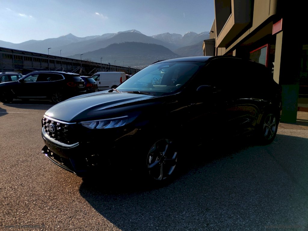 Mod. ST-LINE - Alimentazione Full Hybrid HEV (Benzina Elettrico) - Cambio automatico CVT e-shifter - 7662 Sedili in tessuto Mira con impunture - 387A Pneumatici all season - 520A Opzione fumatori - 632 Ruota di scorta - 68WD Winter Pack: Sbrinatore rapido QuickClear, Sedili anteriori riscaldabili, Sedili posteriori riscaldabili, Volante riscaldabile - Vernice - Di Serie: - 7662 Sedili in tessuto Mira con impunture - Barre longitudinali al tetto nere - Cerchi in lega da 18 ST-Line Rock Metallic - Climatizzatore automatico bi-zona - Cruise control - Due USB per seconda fila di sedili - Fari abbaglianti automatici - Fari automatici con funzione Follow Me Home - Fari full LED con luci diurne a LED - Intelligent Speed Assistance (ISA) - Keyless Entry, apertura e chiusura senza chiavi - Lane Keeping System con Road Edge Detection - Luci ambiente - Luci posteriori a LED - Modalità di guida selezionabili - Pre Collision Assist: assistenza pre collisione con telecamera frontale e sistema frenata post impatto - Privacy Glass - Rear View Camera (telecamera posteriore) - Retrovisori elettrici riscaldabili e ripiegabili elettricamente con luci di cortesia - Riconoscimento pedone - Riconoscimento segnali stradali di velocità - Sedili anteriori con regolazione manuale 8 vie e supporto lombare - Sedili posteriori reclinabili 60 40 - Sedili sportivi comfort - Sensore pioggia - Sensori di parcheggio anteriori e posteriori - Spoiler posteriore - Supporto per ricarica wireless - SYNC 4: DAB, Digital Cluster, Navigation System, Quadro strumenti digitale, Sistema audio a 6 altoparlanti, Touchscreen da 13.2 - Volante a base piatta con impunture rosse