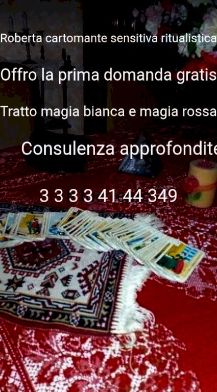 Il servizio di cartomanzia offerto da Roberta vi offro la prima domanda gratuita seria ricordo che la domanda è una risposta al momento non ha approfondito se non rispondo Scrivimi pure su WhatsApp studio Roberta cartomante sensitiva ritualista da anni che svolgo questa attività sono specializzate in lettura dei tarocchi ritualistica seria per aiuto se stai soffrendo per amore o altro chiamami Se posso ti aiuterò se vuoi un consulta approfondita a pagamento per capire meglio la vostra situazione Chiamami potete visitare la mia attività su cartomanti ritualistica Roberta Ivrea Torino Pescara Roma - Brescia Chiavari con fiducia troverai una persona professionale