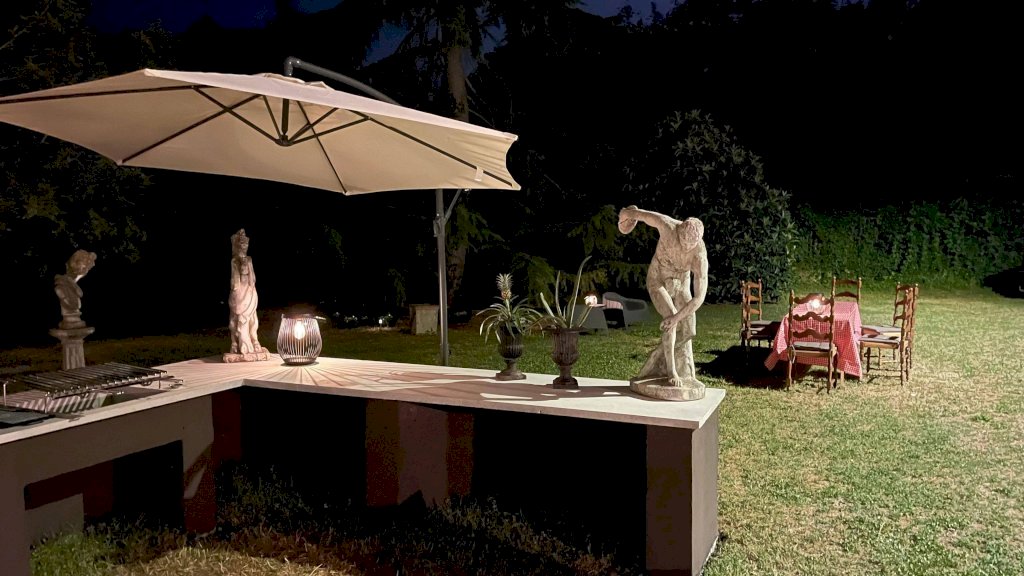 L'incantevole giardino, rigoglioso di verde, dispone di una cucina esterna completamente attrezzata e di una zona pranzo, perfetta per pasti tranquilli con amici e familiari. Accedendo al piano terra attraverso un pittoresco portico a galleria, troverete un ampio ingresso che conduce a una cucina e un bagno, insieme a tre stanze aggiuntive che offrono infinite potenzialità. Questa sezione della casa, che deve ancora essere completata, potrebbe facilmente essere trasformata in una deliziosa guesthouse o dependance privata.