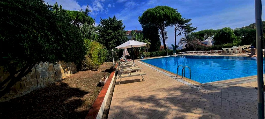 SANREMO FOCE, PRIMA COLLINA, IN RESIDENCE CON PISCINA E PINETA CONDOMINIALE, MONOLOCALE VISTA MARE, PIANO ALTO, 4 POSTI LETTO, ASCENSORE, PARCHEGGIO COPERTO PERTINENZIALE,