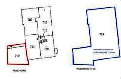 L'immobile è formato da ingresso al piano terra, scala di accesso interna che porta al primo piano dove si trovano soggiorno con balcone e angolo cottura, un bagno e una camera da letto. Vi è un collegamento diretto mediante da scala interna ad un sottotetto di 310 mq. Sottotetto venduto in quota.