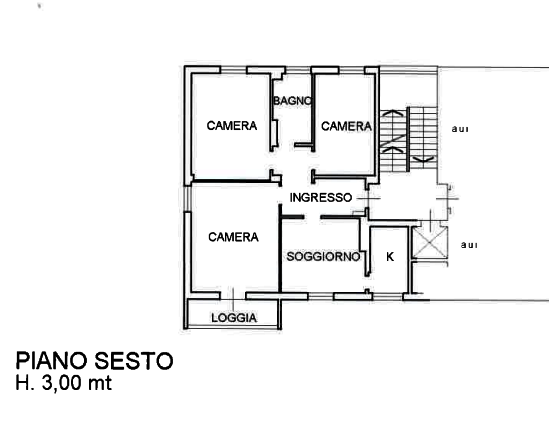L'immobile è posto al piano sesto, composto da un ingresso, un soggiorno, una cucina, un disimpegno, tre camere ed un bagno oltre a loggia.