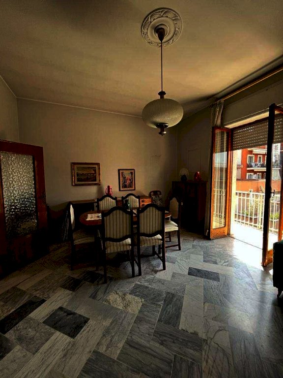L'appartamento si sviluppa su una superficie di Mq 150 circa ed è costituito da ingresso con disimpegno ove insiste un ripostiglio, da una luminosa cucina abitabile con balcone, da un ampio salone ricevente aria e luce naturale da un balcone con affaccio su Piazza Terme, da uno studio ricevente aria e luce naturale da un balcone con affaccio su Piazza Terme, da un bagno con finestra, da camera da letto ricevente aria e luce naturale da un balcone con affaccio su Piazza Terme e da un'ampia e luminosissima cameretta.