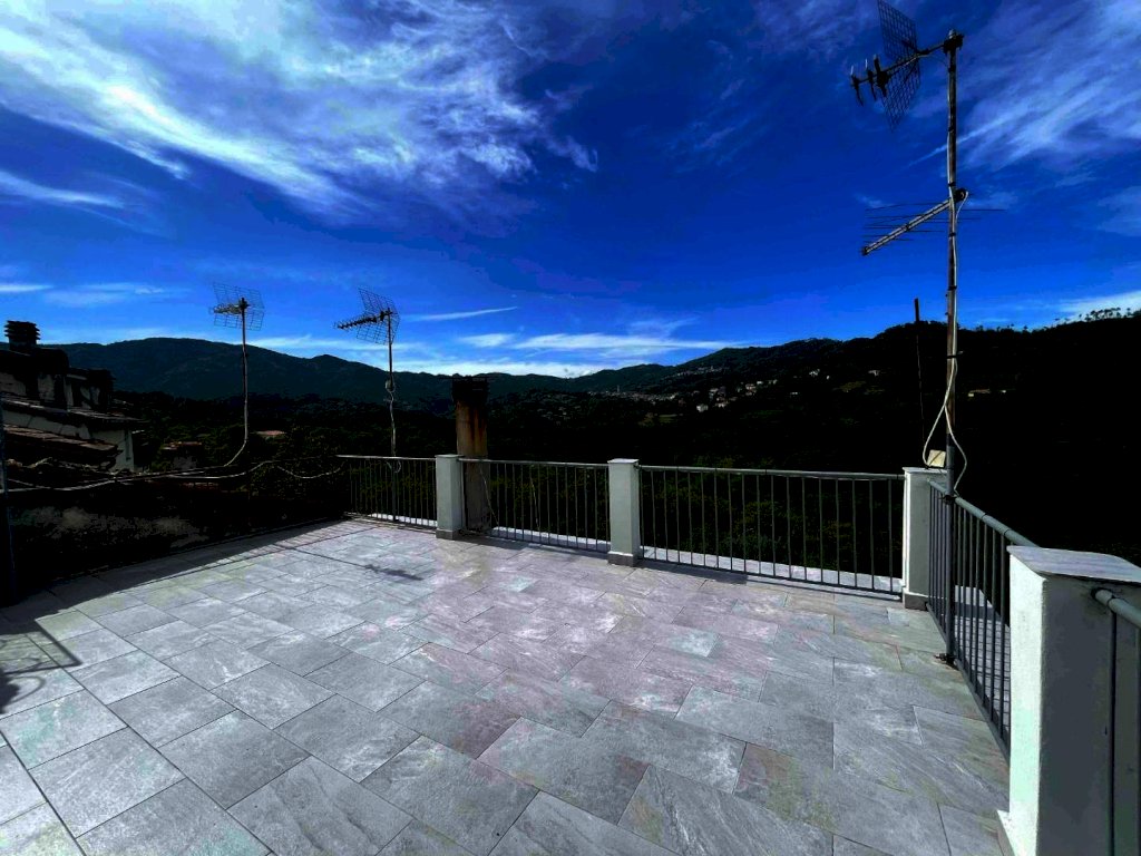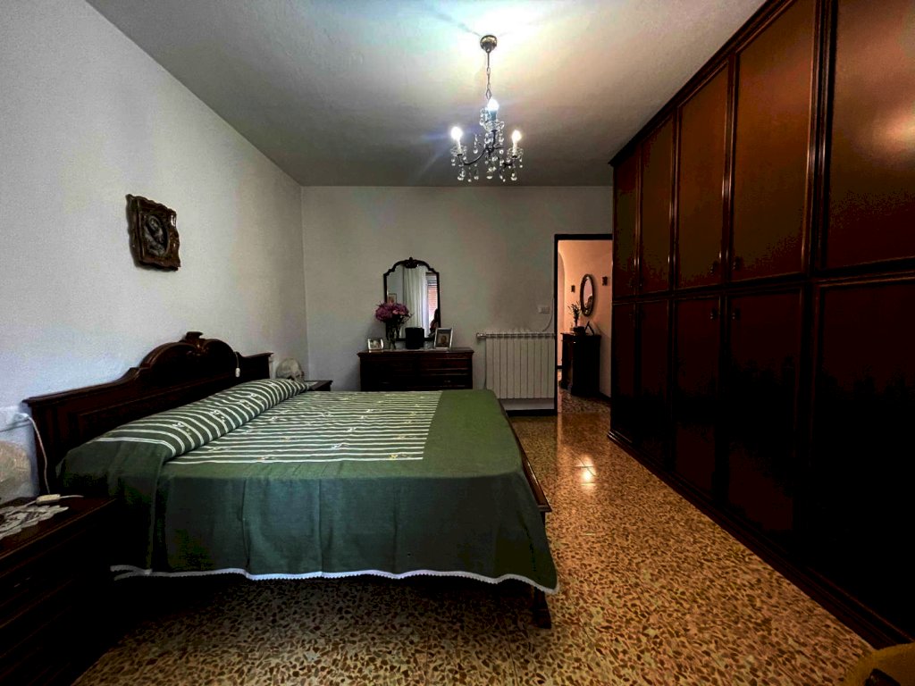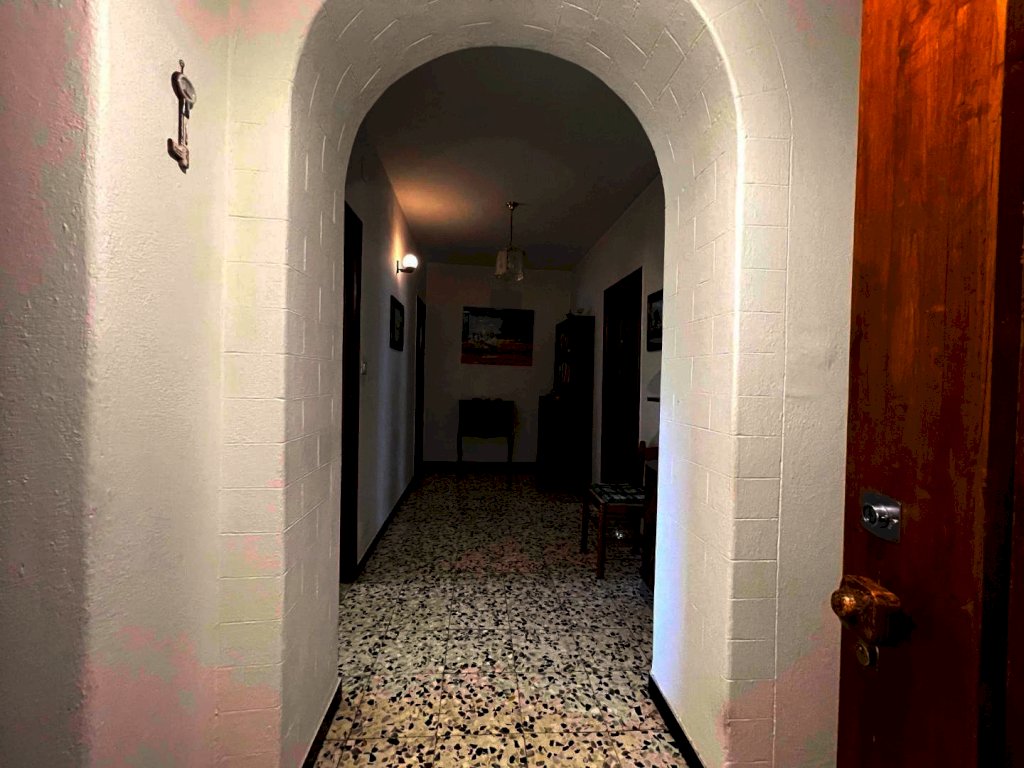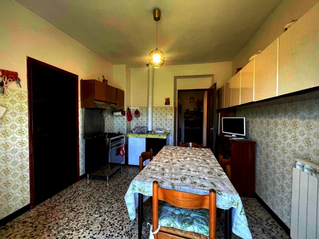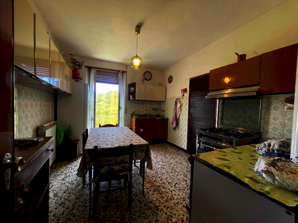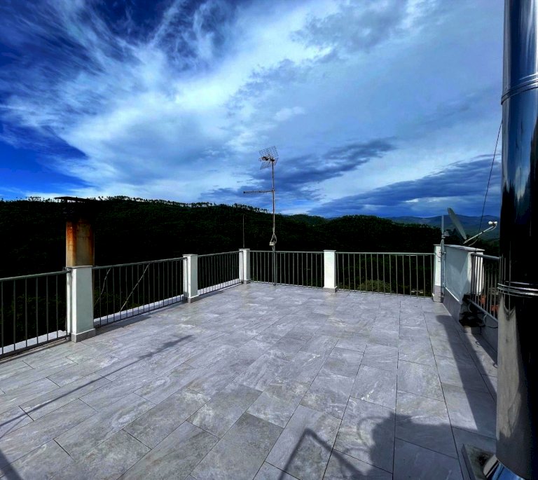 La proprietà è raggiungibile con l’auto, con accesso privato e protetto da un cancello ed è composta da un ampio appartamento di mq. 147 al secondo e ultimo piano di una palazzina di solo tre unità immobiliari composto da ampio disimpegno d'ingresso, cucina abitabile con dispensa dotata di finestra, salone con camino e balcone panoramico con accesso diretto sia dalla cucina che dal salone, stanza da bagno, ampissima camera matrimoniale, altra camera e camera singola. Riscaldamento autonomo. Al piano superiore troviamo un lastrico solare praticabile di mq. 36 con vari ripostigli nel sottotetto. Le finiture sono degli anni' 80 ottimamente tenute: pavimenti in graniglia e infissi di legno. Al piano semi-interrato un’ampia cantina/taverna di mq. 77 con forno a legna e bagno di servizio. All’esterno una secondo deposito attrezzi di mq. 10 e un terzo magazzino di mq. 42. La superficie totale dei terreni è di mq. 956.