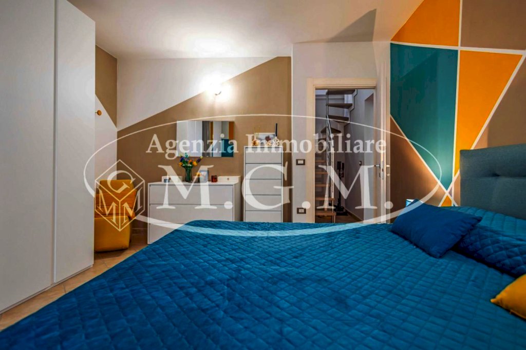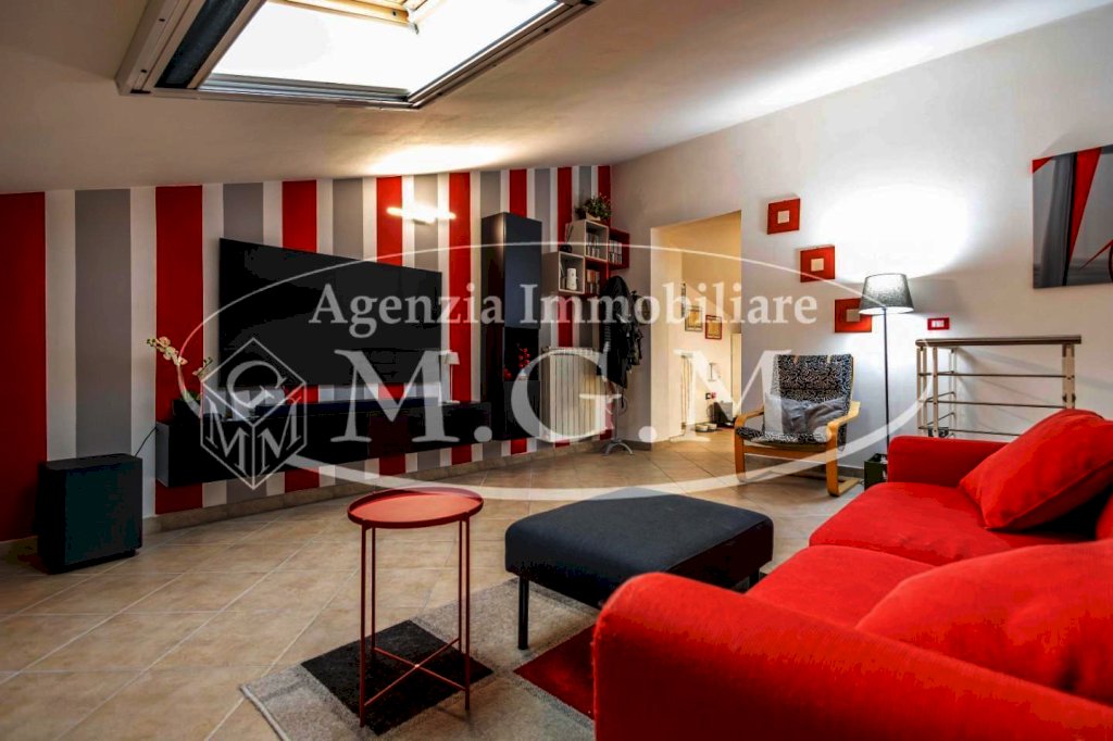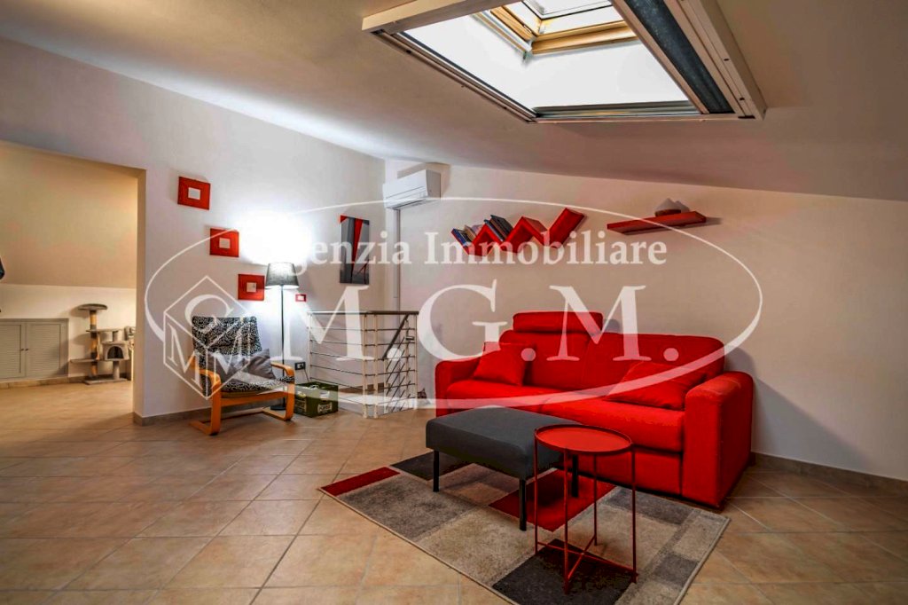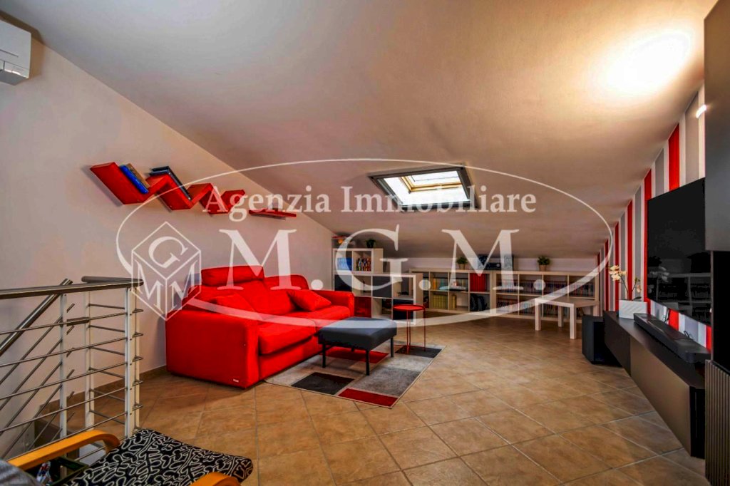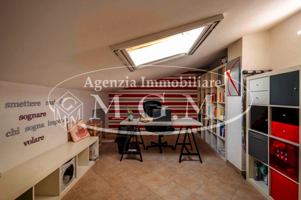 Una scala di arredo, anch’essa nuova, porta al piano mansardato: un ambiente molto versatile, con lucernari nuovi, composto da una seconda zona living e da una stanza attualmente adibita a studio, facilmente trasformabile in terza camera o locale multifunzione.