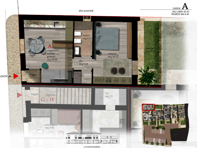 SOL. A - Appartamento posto al piano terra rialzato con ingresso indipendente tramite piccolo loggiato. Composto da ingresso in soggiorno-cucina, camera matrimoniale, bagno con finestra, ripostiglio. RESEDE PRIVATO. POSTO AUTO.