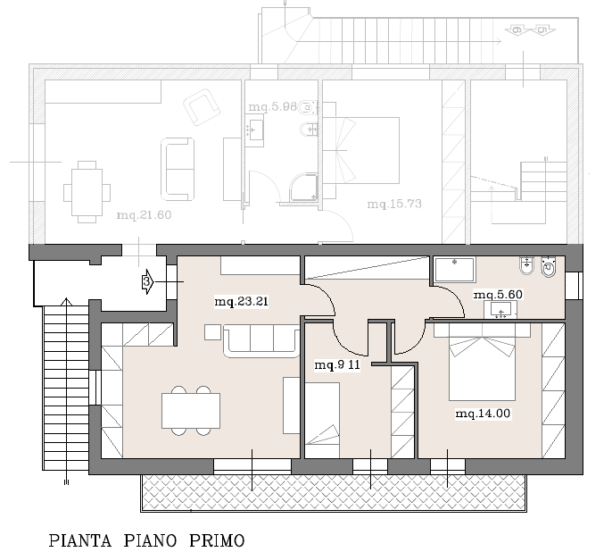 Ingresso da scala esterna, che serve solo due appartamenti, in soggiorno con angolo cottura/pranzo, dalla zona giorno e dalla zona notte è possibile accedere al balcone esterno, disimpegno notte arredabile, due camere di cui una matrimoniale e una singola, bagno con doccia e finestra.