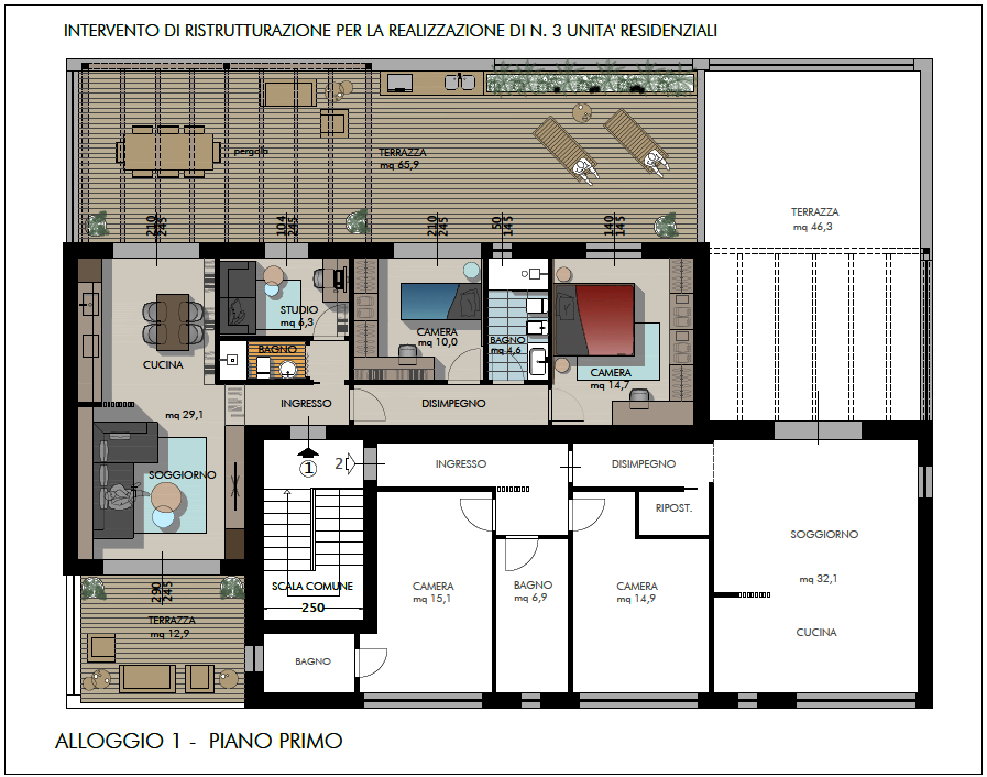 Rif. V1010 (Appartamento 1) CASCINA APPARTAMENTO 4/5 VANI di circa 90 mq, inserito in piccolo fabbricato in fase di completa ristrutturazione, si sviluppa su unico livello al primo ed ultimo piano, al quale si accede da vano scala interno in comunine con un'altro appartamento. E' corredato in proprietà di una comodissima cantina al piano terra. La particolarità di questo immobile è lo spazio esterno esclusivo di cui è dotato, infatti dalla zona giorno e dalla zona notte si può accedere a ben due terrazze ampie e confortevoli, una di circa 13 mq accessibile direttamente dal soggiorno, l'atra grandissima di circa 66 mq accessibile direttamente dalla cucina, ottima soluzione per sfuttarla nei mesi più caldi per pranzi e cene all'aperto, verra dotata di una pergola per la massima privacy. Il progetto prevede la seguente suddivisione: una piccola zona d'ingresso che va a confluire nel grande spazio della zona giorno, open space di ben 30 mq, luminosissima e fortemente areggiata grazie alla dimensione delle aperture verso le terrazze. Sempre dalla zona giorno si accede allo studio e al bagno di servizio. In fine il reparto notte si articola in disimpegno, due camere (1 matrimoniale, 1 media) e bagno, reparto notte si articola nel disimpegno e da due camere.