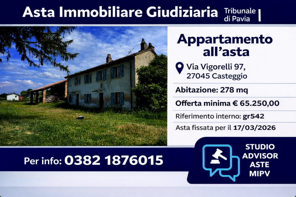In posizione comoda e ben servita nel comune di Casteggio proponiamo in asta giudiziaria un appartamento ideale sia come abitazione principale sia come investimento. L’immobile è situato al piano terra e si compone di: Abitazione al piano terra di un vano oltre servizi e al piano primo di tre vani oltre servizi, auto-rimessa, tettoia, altro fabbricato adibito a deposito con portico al piano terra e soprastante fienile, area pertinenziale e terreni che si trovano in prossimità dei fabbricati.