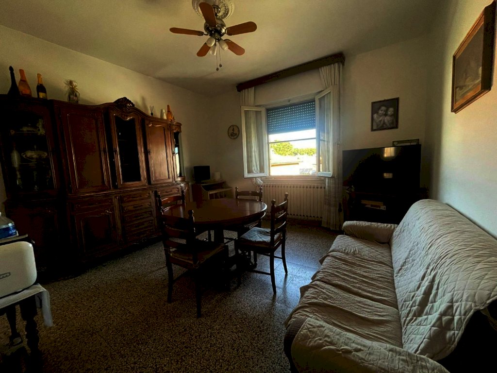 vendesi appartamento al piano secondo ed ultimo di un piccolo fabbricato condominiale composto da ingresso, cucinotto, sala pranzo, soggorno grande, bagno, 2 camere matrimoniali e ripostiglio. Completano la proprietà un box, un garage ed una porzione di terreno. Posto auto.