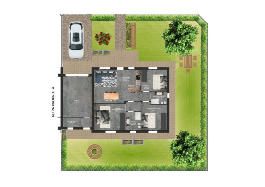 Gli appartamenti hanno una superficie di circa 90 mq oltre a 20 mq di autorimessa più locale tecnico, con 250 mq di giardino (appartamento p. terra) o 60 mq di terrazza (appartamento al p.1).