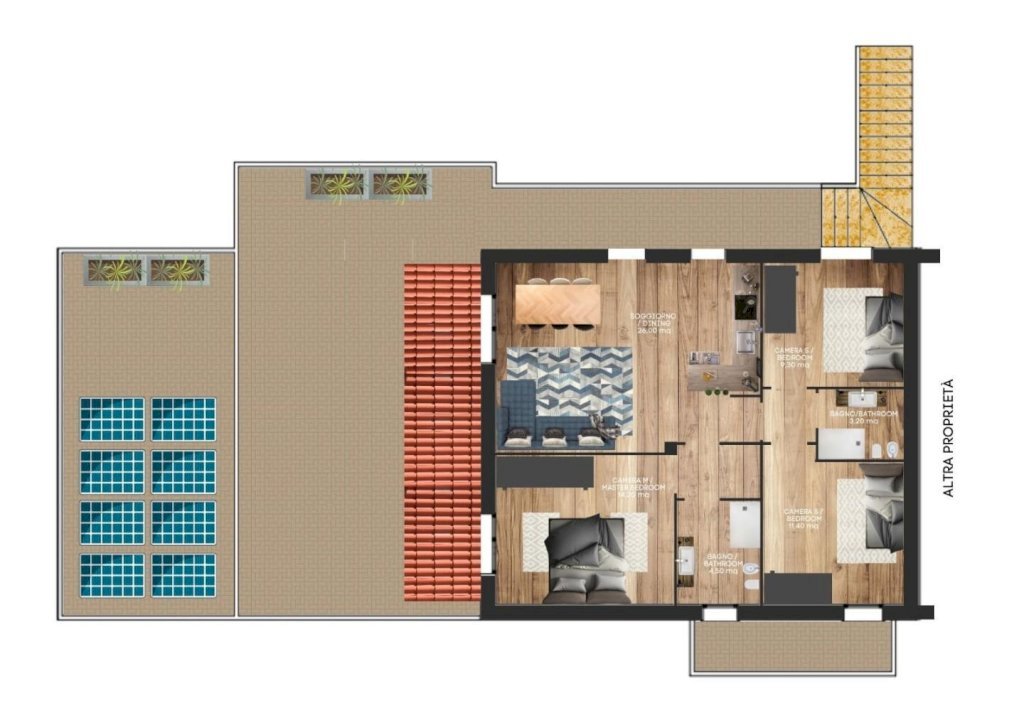 Sono composti da soggiorno con angolo cottura, disimpegno, tre camere di cui una matrimoniale, un doppia e una singola, oltre a due bagni. La distribuzione degli spazi è ben progettato.