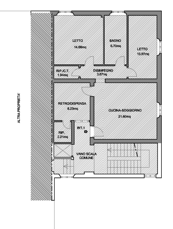 L'immobile è cosi composto: ingresso direttamente sulla zona pranzo / soggiorno, angolo cucina con ripostiglio; zona notte con disimpegno, un bagno (finestrato), due camere da letto (Matrimoniale e singola) e altro ripostiglio / Centrale Termica.