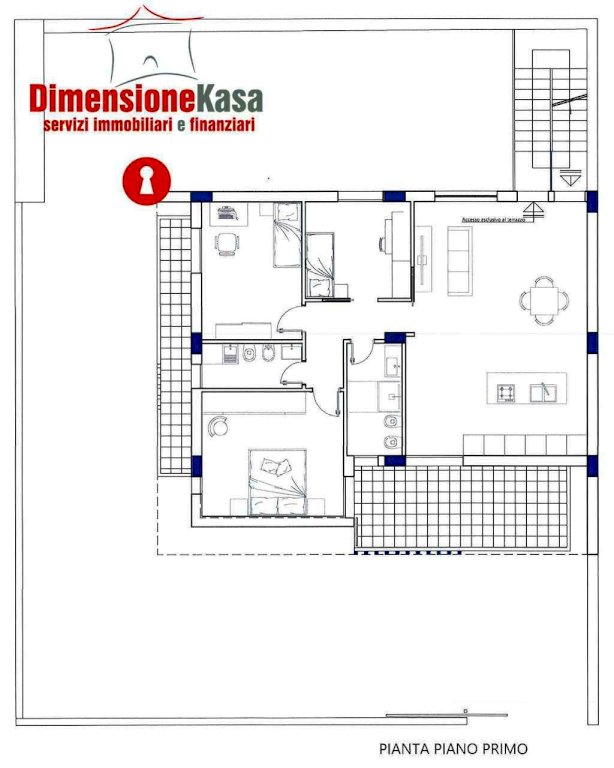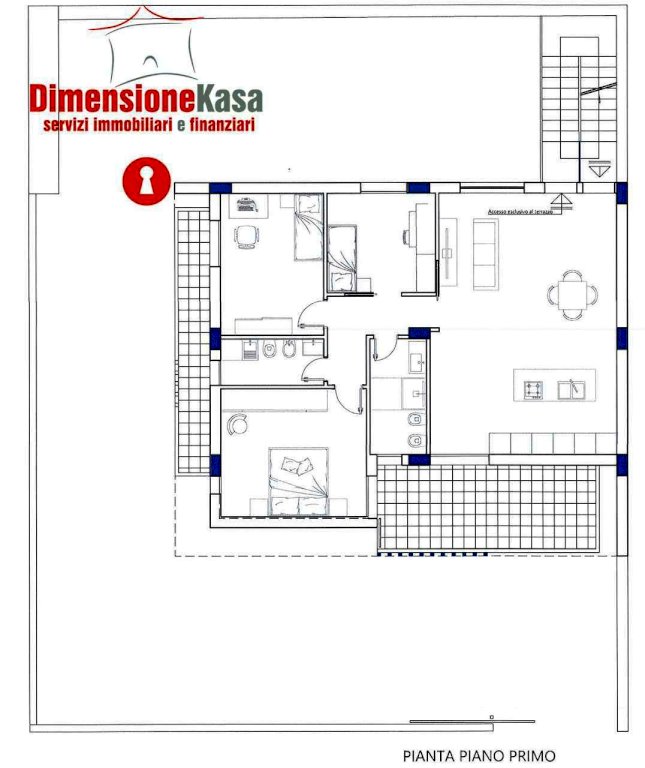 L'appartamento al primo piano offre un ampia zona giorno, 3 camere da letto e doppio accessorio, con un vantaggio in più: un ampio terrazzo di copertura di 135 mq. pavimentato e attrezzato con cucina esterna. Questo spazio esterno, perfetto per essere arredato con piante, sdraio o una zona pranzo, permette di godere della vista panoramica e di un'ulteriore area privata dove rilassarsi in totale privacy. Anche qui, l'ingresso è indipendente, garantendo la stessa autonomia e comfort del piano rialzato, mentre il box auto di 50 mq è l'ideale per chi cerca spazio extra per un'auto e attrezzature.