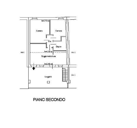 L'immobile è posto al piano secondo, con accesso da sola scala esterna, è così composto: loggiato, ingresso diretto in area soggiorno con zona cottura, disimpegno, un bagno con la sola presenza di un lucernario, due camere da letto.