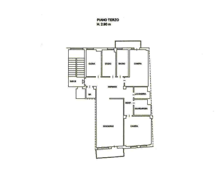 L'immobile è posto al terzo piano, dotato di ascensore, ed è composto da ingresso, cucina, ripostiglio, soggiorno, studio, bagno, disimpegno, due camere, lavanderia, guardaroba e due terrazzi, per una superficie complessiva di circa 148 mq.