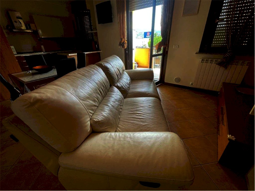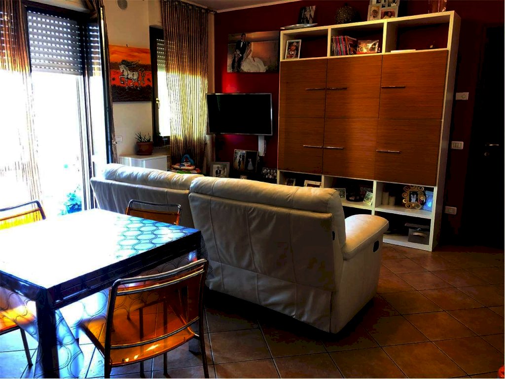 L'appartamento è così composto: Ingresso, ampio soggiorno, angolo cottura con penisola, ben diviso dalla zona divani, disimpegno, 2 (due) camere matrimoniali, bagno con finestra e doccia, oltre a terrazzo vivibile.