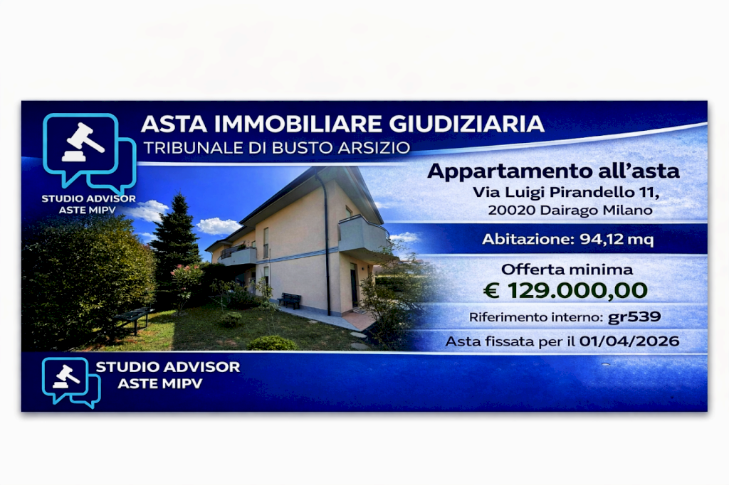 Questo annuncio è stato redatto da Studio Advisor Aste MiPv sulla base della documentazione ufficiale di vendita. Le informazioni qui riportate non sostituiscono la pubblicità legale e potrebbero contenere imprecisioni o variazioni rispetto agli atti ufficiali. Studio Advisor Aste MiPv declina ogni responsabilità per errori, omissioni o modifiche intervenute successivamente alla pubblicazione.