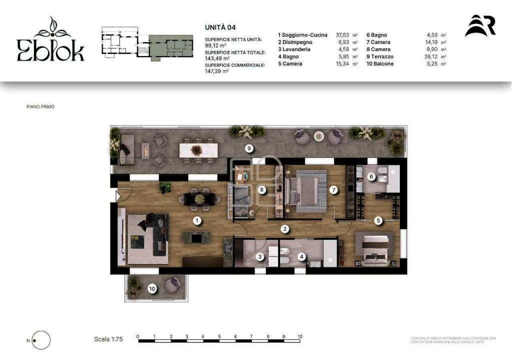 All'interno di questo prestigioso contesto, proponiamo l'unità 04, un quadrilocale collocato al primo piano che si distingue per l'ampia zona living con cucina a vista, caratterizzata da grandi vetrate che si aprono ad ovest su un balcone e ad est su una spettacolare terrazza di oltre 40 mq: un secondo soggiorno all'aperto, perfetto per godersi piacevoli momenti di relax e di convivialità. La zona notte ospita una camera padronale con bagno privato, una seconda camera matrimoniale, una terza camera singola, un ulteriore bagno finestrato e un comodo locale tecnico/lavanderia.