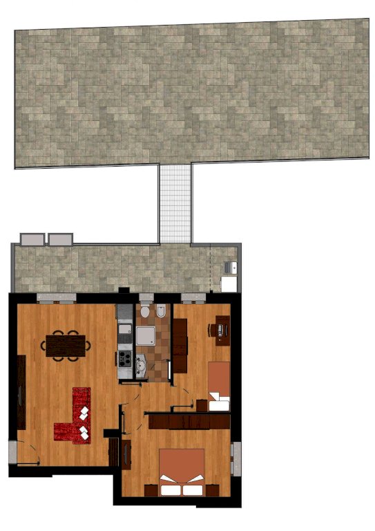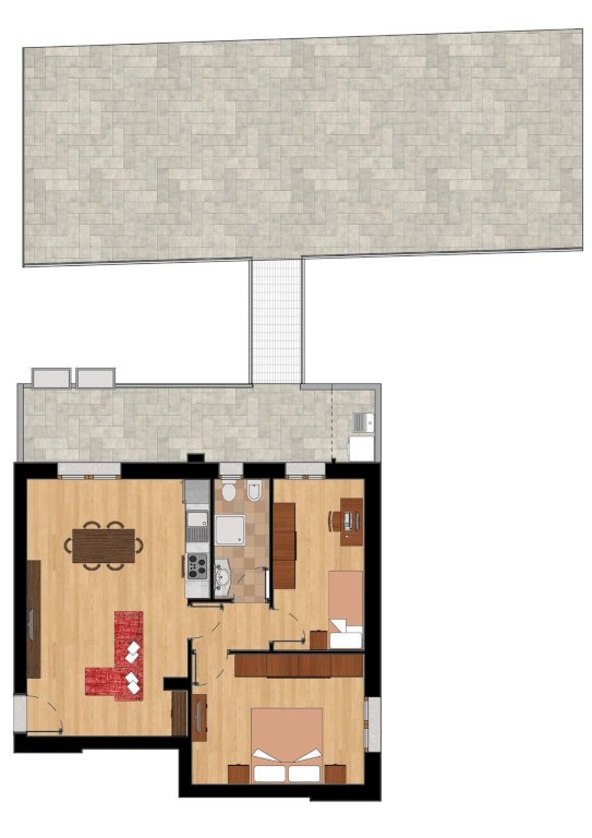 L’ingresso conduce a un luminoso soggiorno-pranzo con angolo cottura, progettato per offrire funzionalità ed eleganza, con affacci diretti sugli spazi esterni che amplificano la sensazione di continuità tra interno ed esterno.