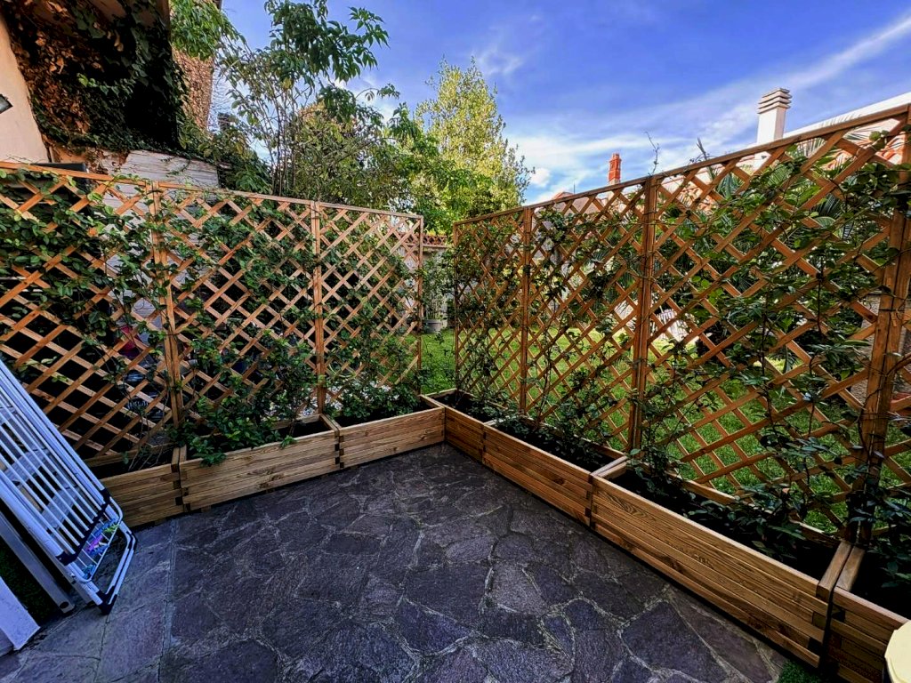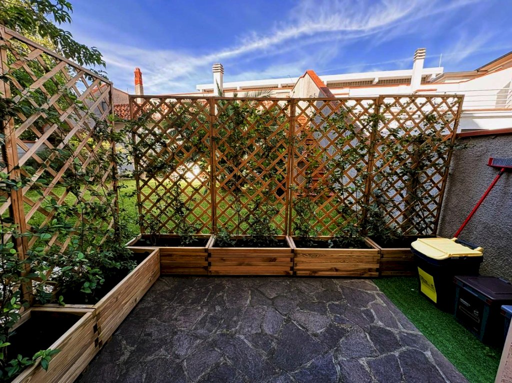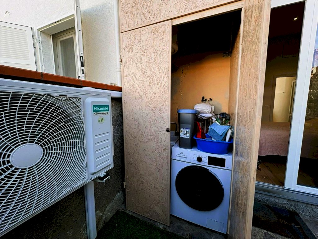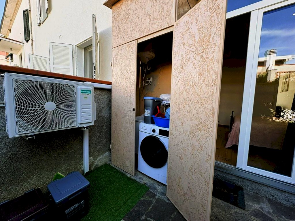 In questo comodo e riservato spazio esterno posteriore, ben protetto dalla viabilità principale, si trova anche un mobilio con caldaia e lavatrice.
