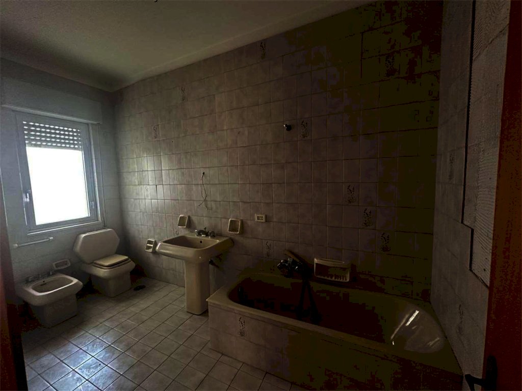 Il trivani, in discrete condizioni e con rifiniture dell'epoca, ha ingresso sul corridoio, grande salone con primo balcone condiviso, cucina abitabile con il secondo balcone condiviso, bagno principale con vasca e finestra, doppio servizio con spazio per la lavatrice e box doccia e finestra, camera matrimoniale con accesso al primo balcone condiviso, camera da letto con accesso al secondo balcone condiviso, ripostiglio. Completa la casa il posto auto singolo coperto (presente nel garage comune di 229 mqc, dove รจ presente anche lo sgabuzzino) e la terrazza comune.