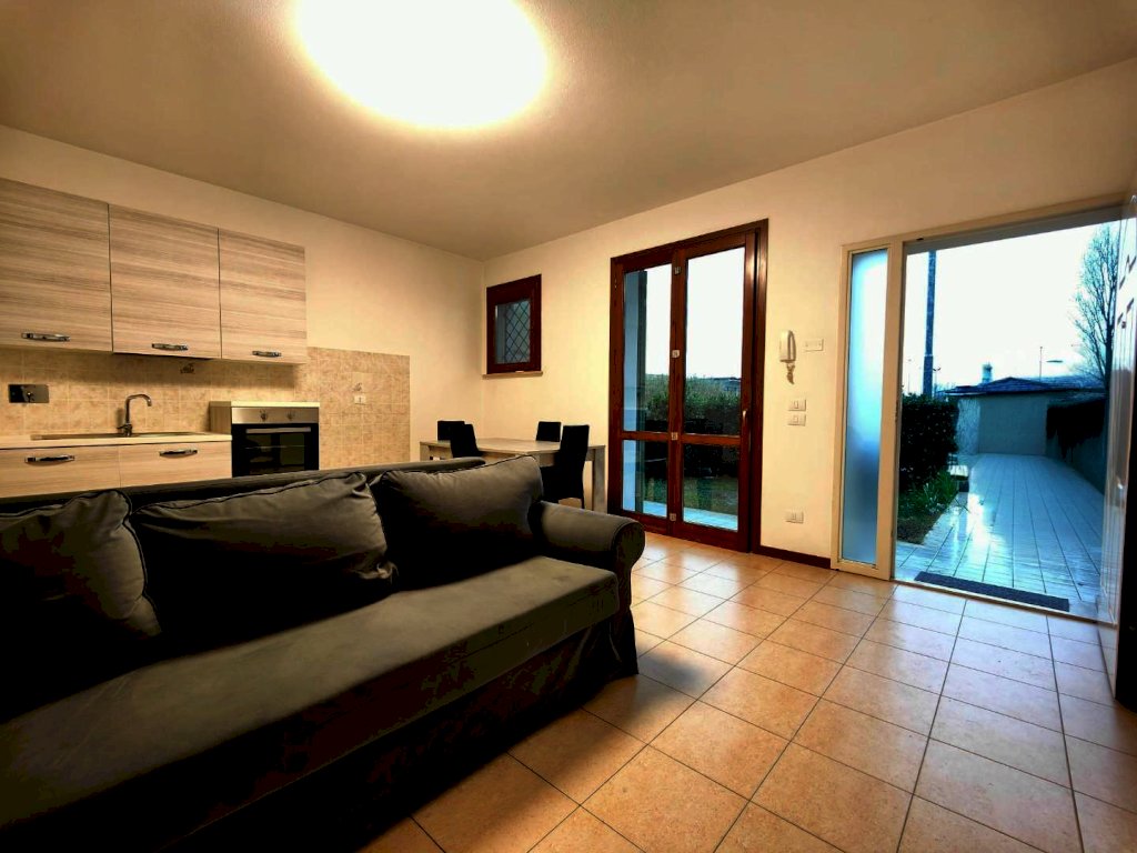 Soggiorno con cucina a vista e accesso diretto al giardino, ideale per vivere gli spazi esterni
