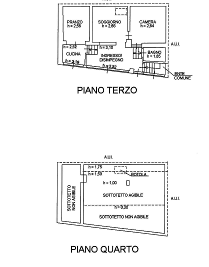 Unità al piano terzo di un fabbricato di quattro piani fuori terra composto da ingresso-disimpegno, cucina, zona pranzo, soggiorno, un bagno e una camera, con annesso sottotetto al quarto piano.