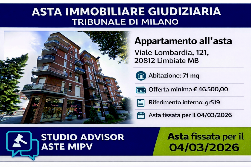 Questo annuncio è stato redatto da Studio Advisor Aste MiPv sulla base della documentazione ufficiale di vendita. Le informazioni qui riportate non sostituiscono la pubblicità legale e potrebbero contenere imprecisioni o variazioni rispetto agli atti ufficiali. Studio Advisor Aste MiPv declina ogni responsabilità per errori, omissioni o modifiche intervenute successivamente alla pubblicazione.