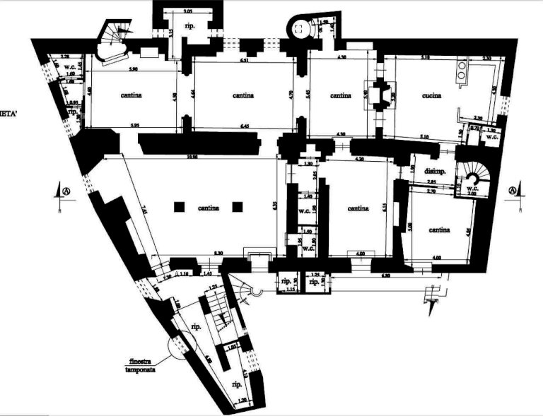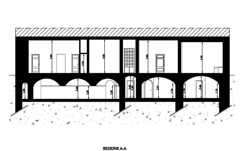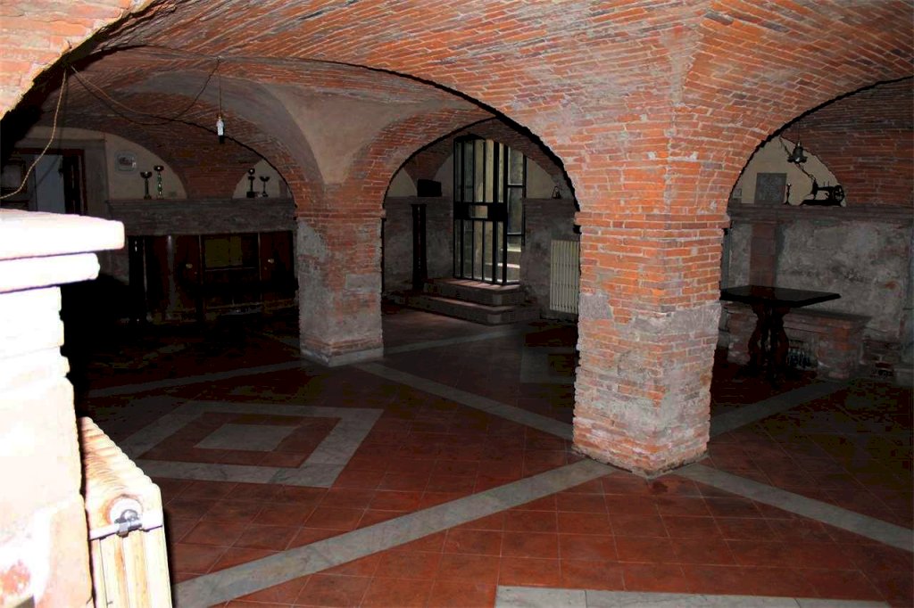 A mezzo di una scala interna o da due accessi esterni, si accede a 250 mq di cantine ristrutturate con soffitti a volta ( H 2,40 ) e pavimentazione in cotto, diviso in tre saloni dove è presente un forno a legna funzionante, un caminetto e una grande cucina attrezzata.