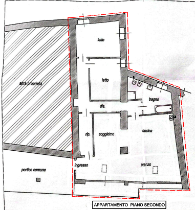 L'immobile è posto al secondo piano ed è cosi composto: è composto da ingresso, ripostiglio, soggiorno/pranzo, angolo cottura, disimpegno, bagno, disimpegno, due camere, balcone sulla zona giorno.