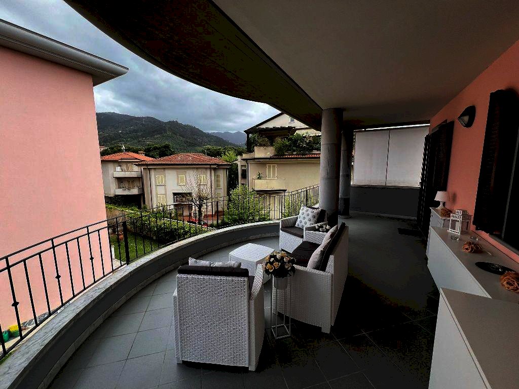 MASSA ZONA CENTRALE VENDESI IN CONDOMINIO MOLTO SIGNORILE AMPIO APPARTAMENTO SITO AL 2° ED ULTIMO PIANO SERVITO DA ASCENSORE, LIBERO SU TRE LATI, COMPLETAMENTE E FINEMENTE RISTRUTTURATO, SI COMPONE DA SOGGIORNO, CUCINA ABITABILE CON AFFACCIO SU GRANDE TERRAZZA ATTREZZATA, DISIMPEGNO, DUE CAMERE MATRIMONIALI, DUE BAGNI CON DOCCIA E FINESTRA, BALCONE E RIPOSTIGLIO. A CORREDO AMPIO GARAGE RAGGIUNGIBILE ANCHE CON ASCENSORE E POSTO AUTO. L'IMMOBILE VIENE LASCIATO COMPLETAMENTE ARREDATO CON MOBILIO MODERNO DI PARTICOLARE PREGIO.