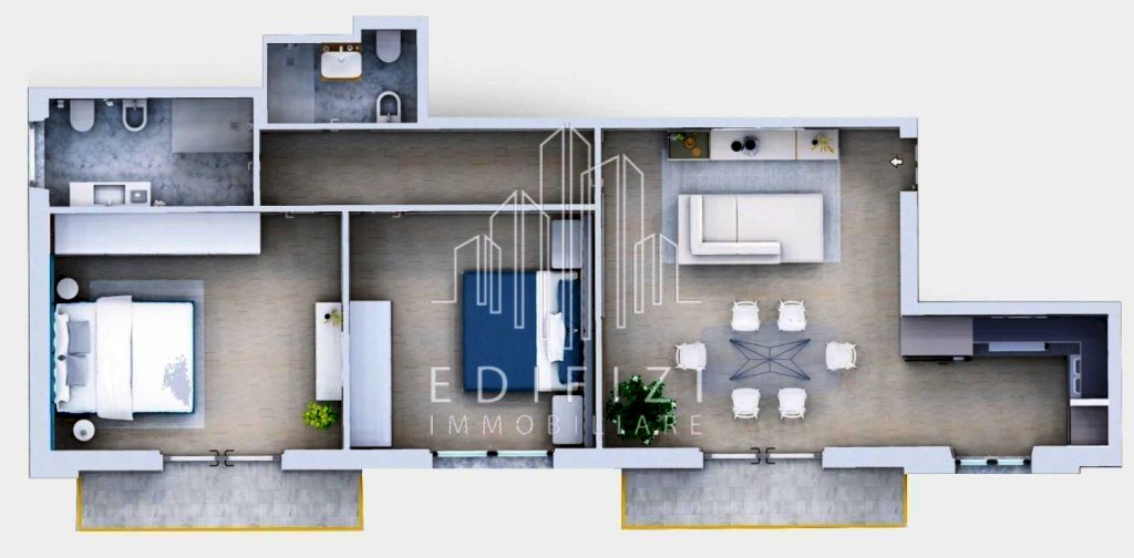 L'immobile, che come la palazzina verrà ceduto completamente ristrutturato, si compone di ingresso su soggiorno con angolo cottura, due camere matrimoniali, e due bagni completi.